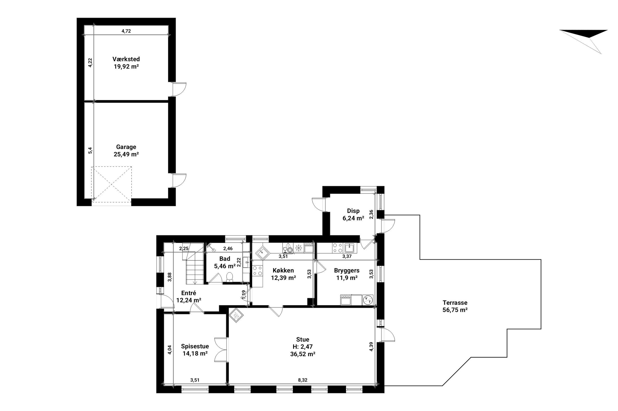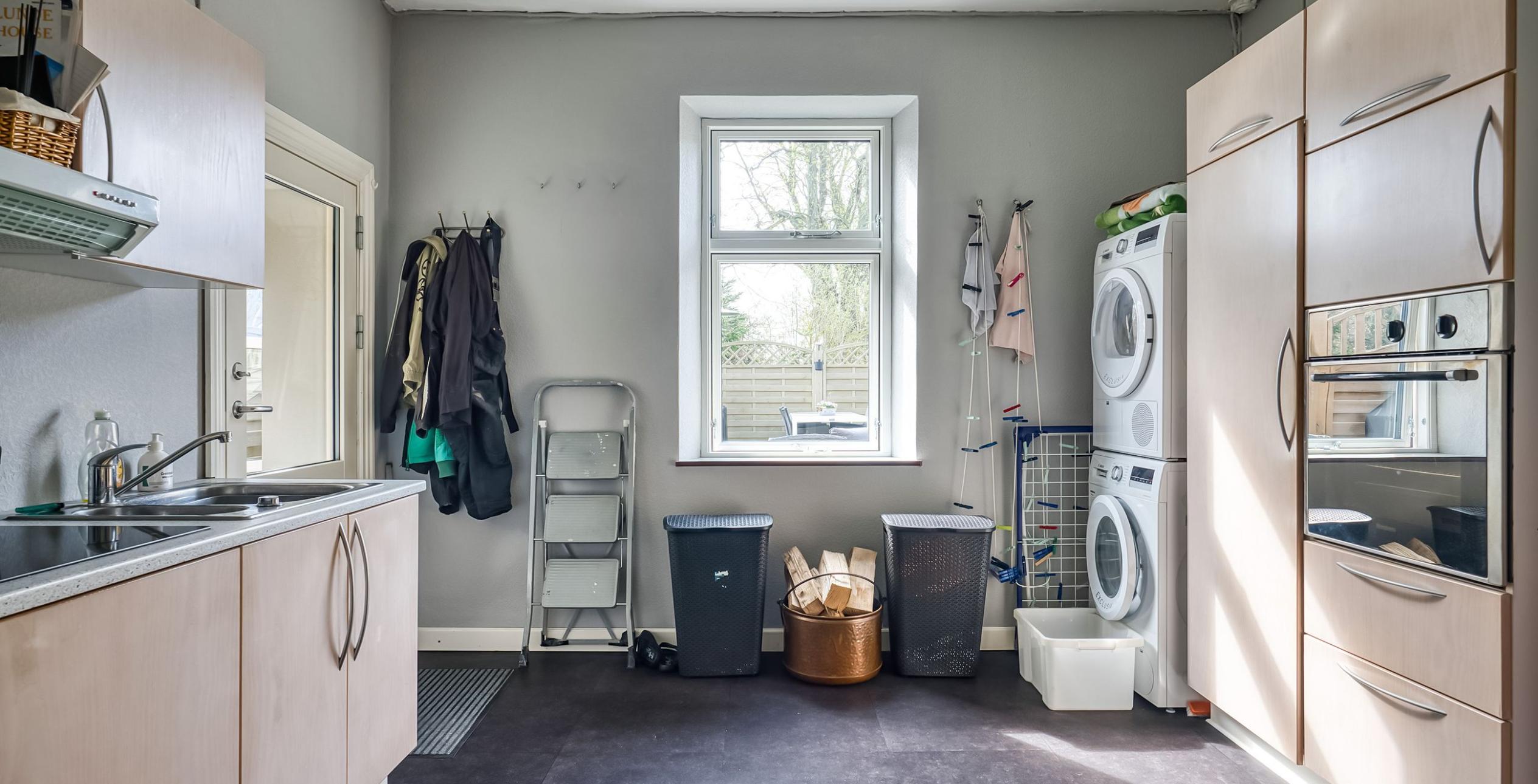 grovkøkken med indbygningsovn og bryggers med vaskeafsnit. I forlængelse ligger