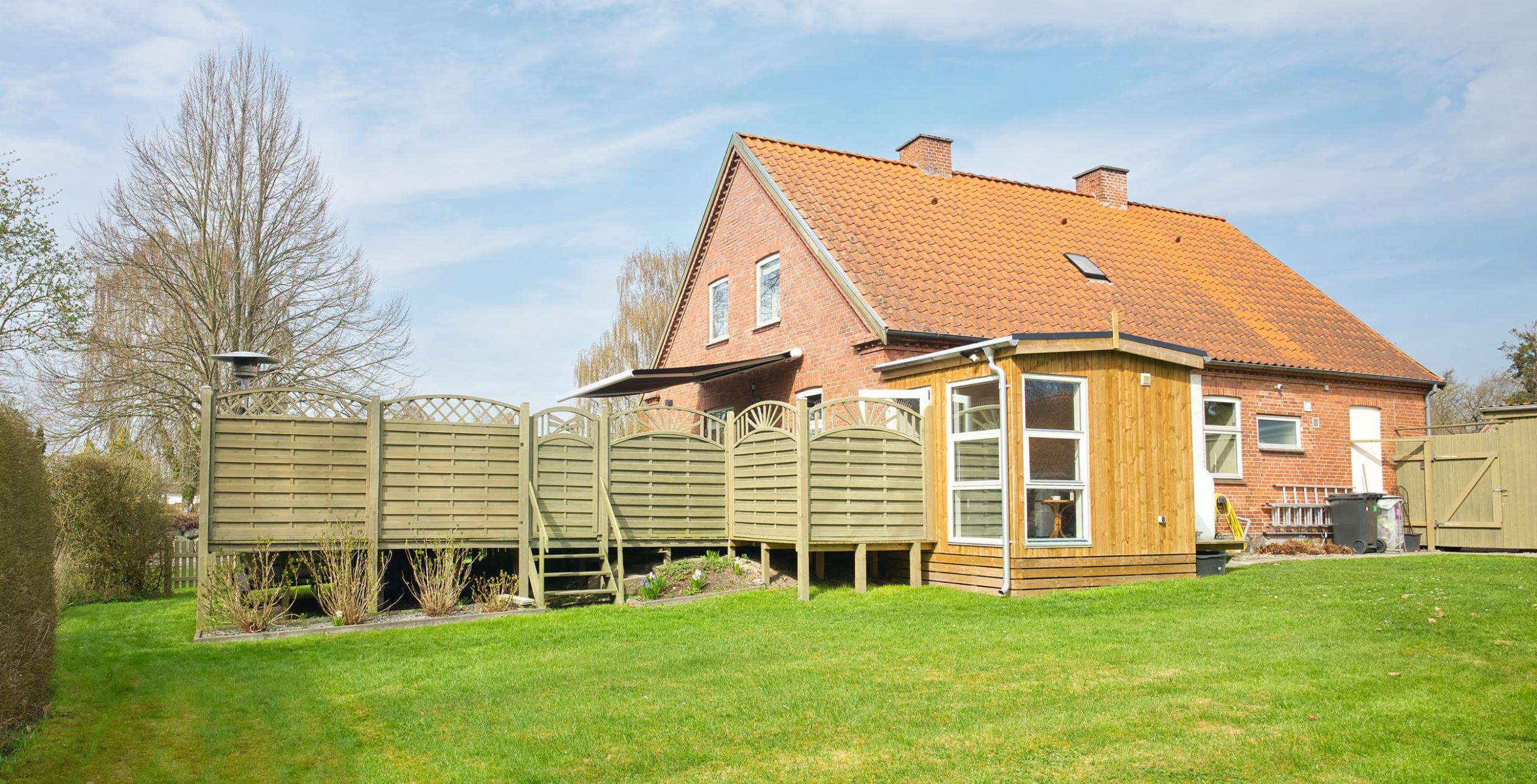 et nylig opført vindfang med både udgang til træterrassen men også baghaven. Derudover