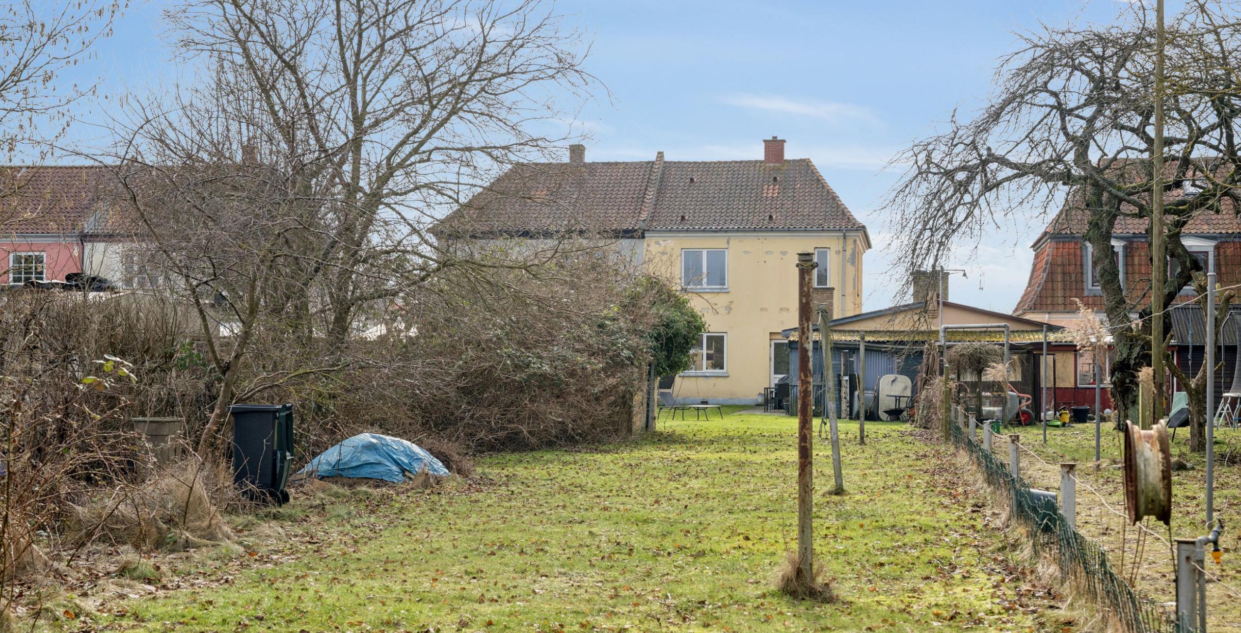 Til ejendommen hører en dobbeltgrund, og dermed med mulighed for at etablere garage/carport for enden af baghaven, der i øvrigt er nem anlagt og med flere frugttræer. Derudover et godt baghus med flere disponible rum til opbevaring, vaskerum, værksted m.m.