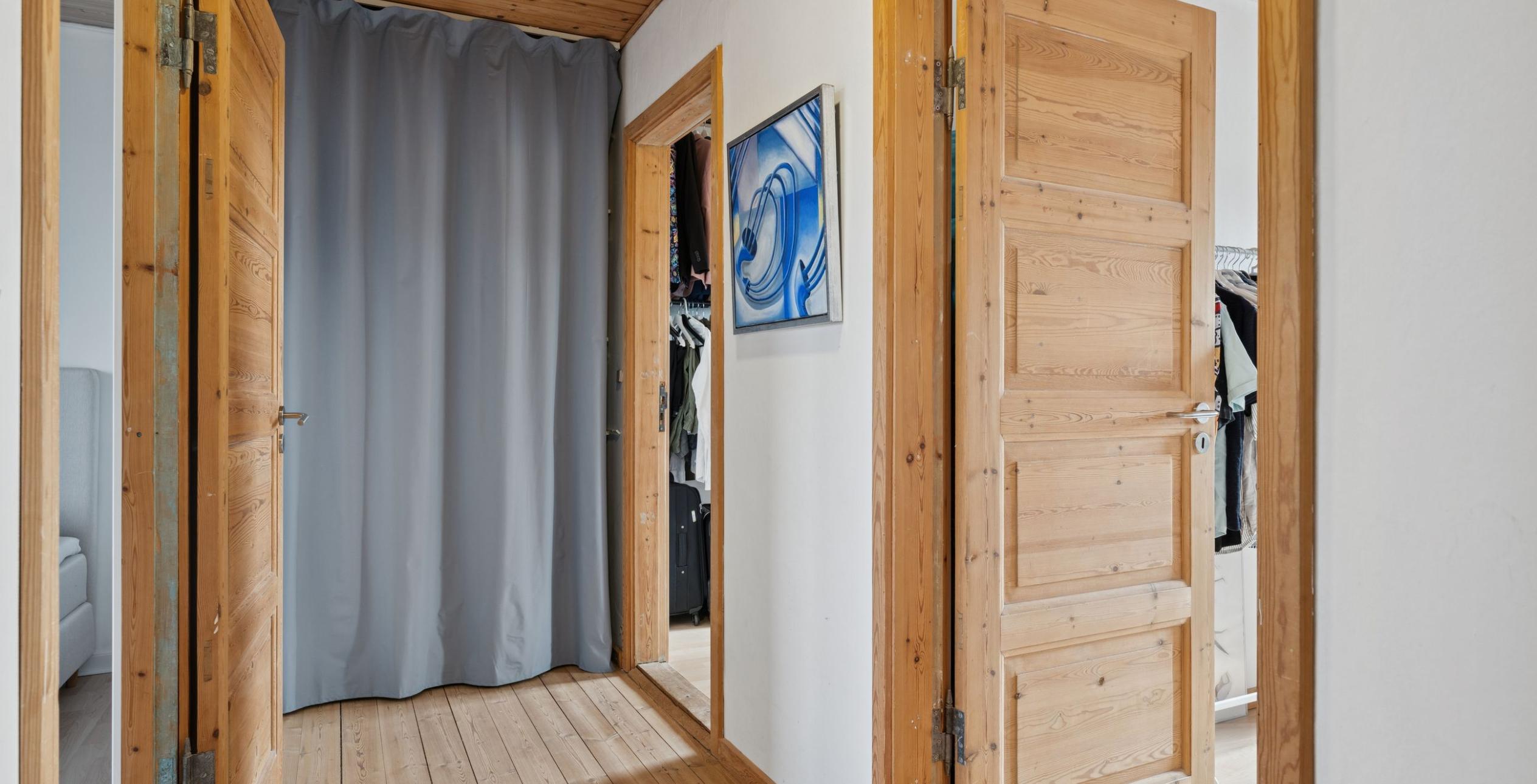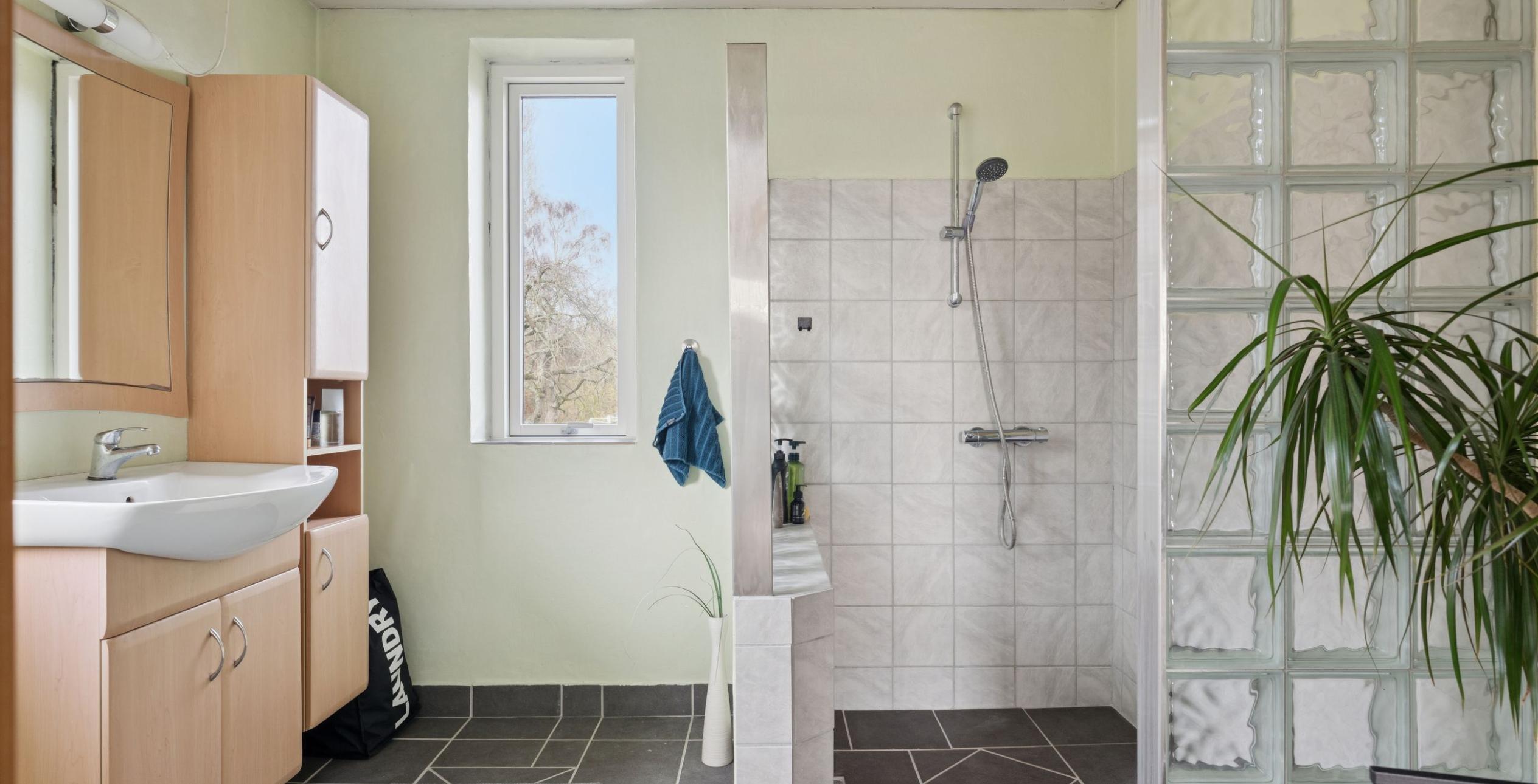 1. salen er indrettet med repos og fordelingsgang. Nydeligt stort flisebadeværelse med toilet, håndvask i skabsarrangement og stor bruseniche samt gulvvarme. Derudover 3 soveværelser med adgang via fordelingsgangen, og dermed ingen gennemgangsværelser.