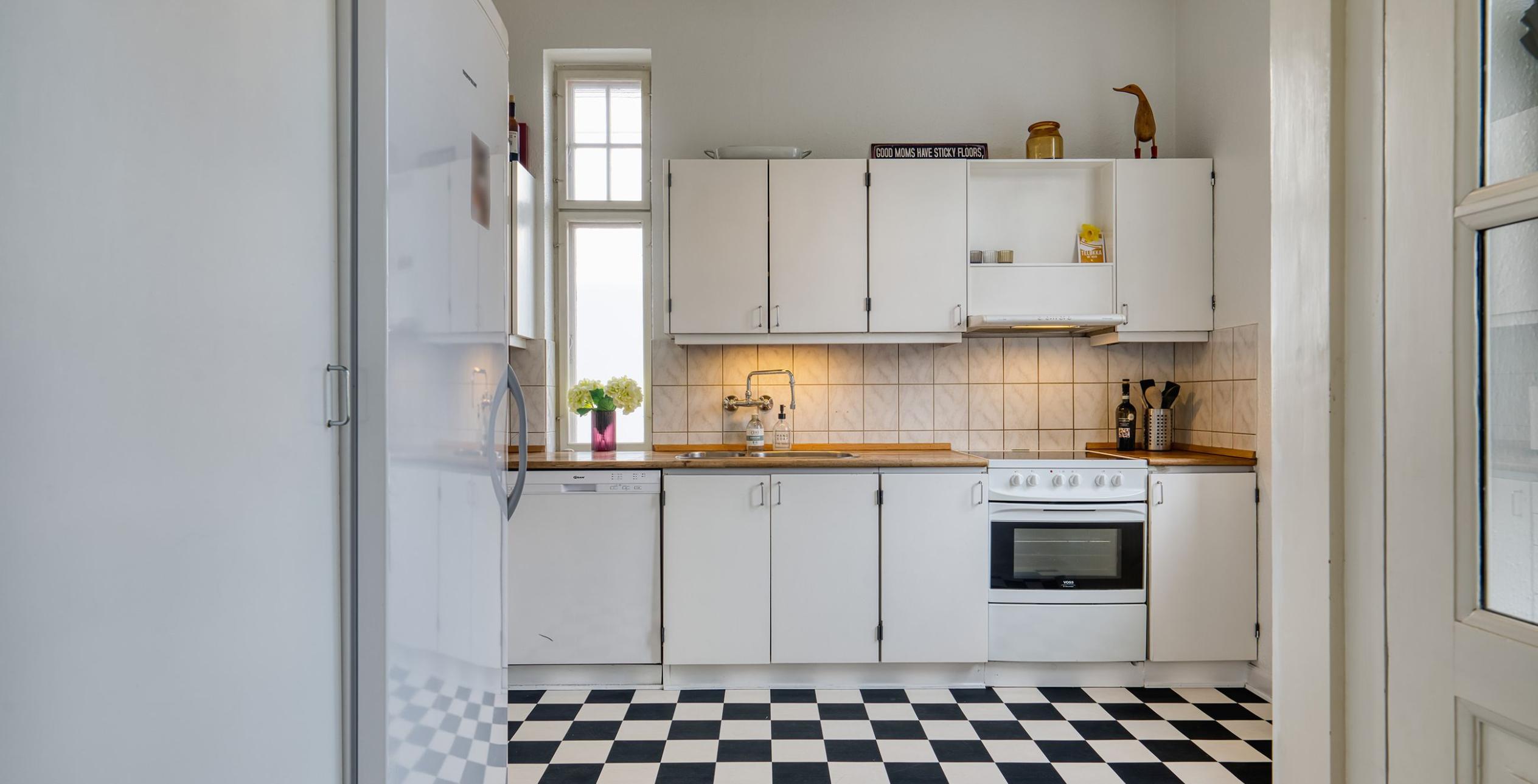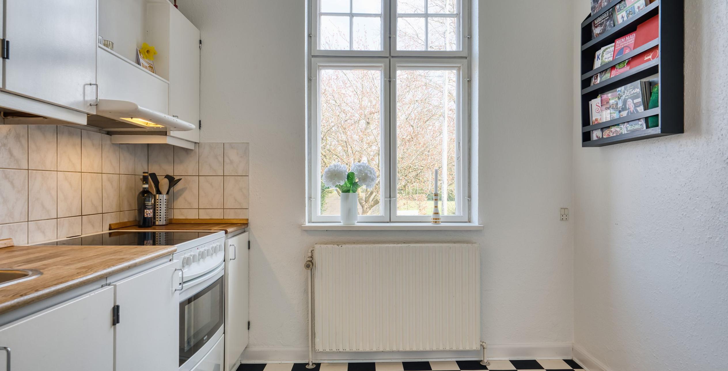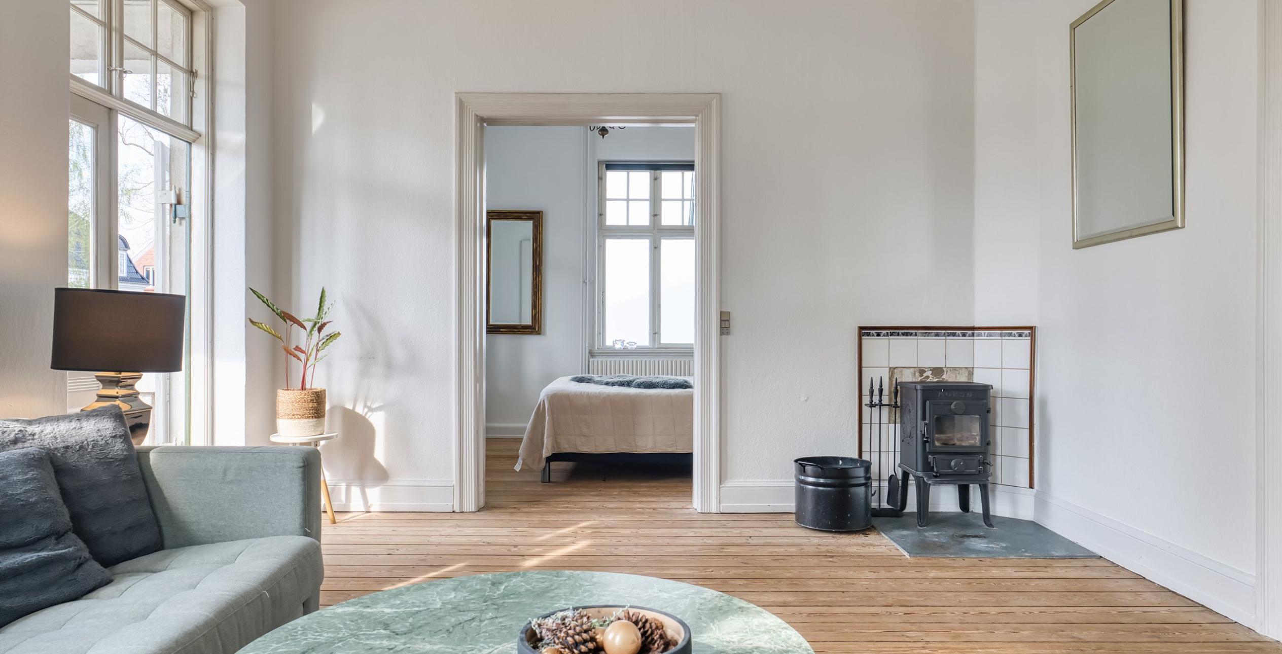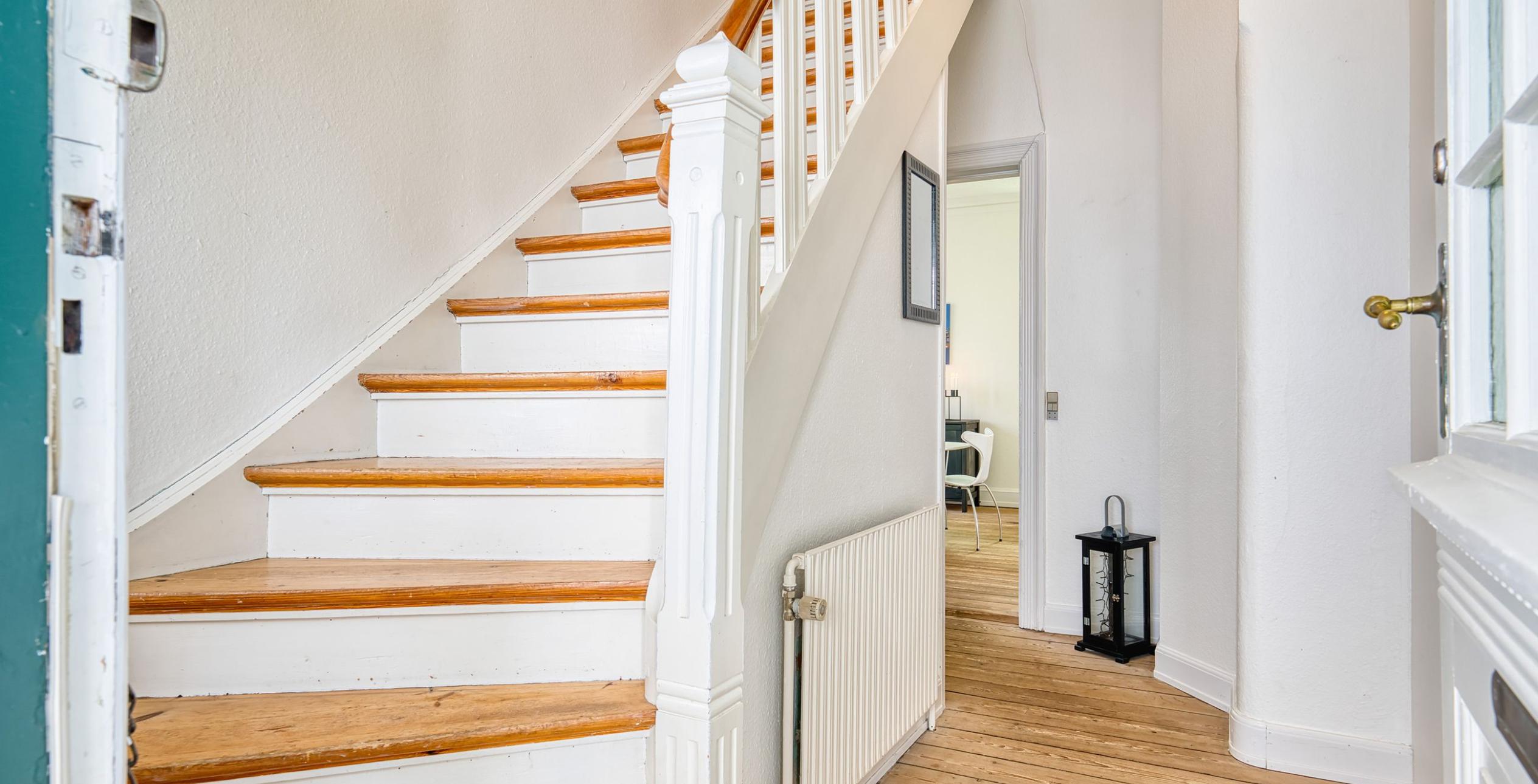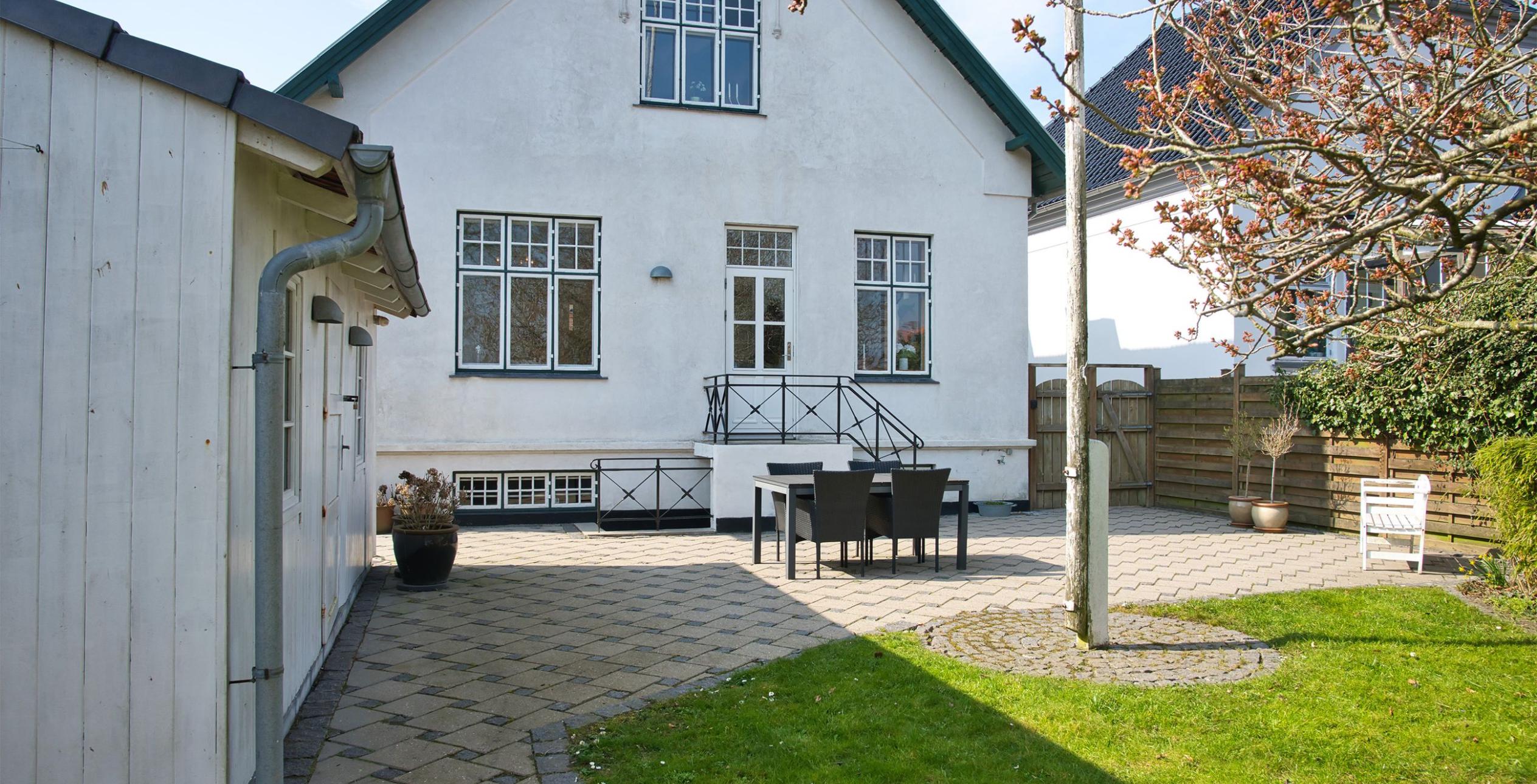 Ejendommen er indrettet med en flot og præsentabel entré. Den tidligere hall kan nemt reetableres ved at åbne til nuværende soveværelse. Fra entréen er der adgang til den store spisestue, hvor der er plads til besøg af den store familie. Med originale franske døre til dagligstuen er der rig mulighed for at lyset kan vandre, ligesom brændeovnen kan gøre en allerede hyggelig aften endnu hyggeligere. Fra dagligstuen er der udgang til den smukke veranda, hvor eftermiddagskaffen kan nydes. I naturlig og delvis åben forbindelse med spisestuen ligger det funktionelle og rummelige køkken med spisekrog, hvorfra der er udgang via mindre vindfang til gårdmiljøet.