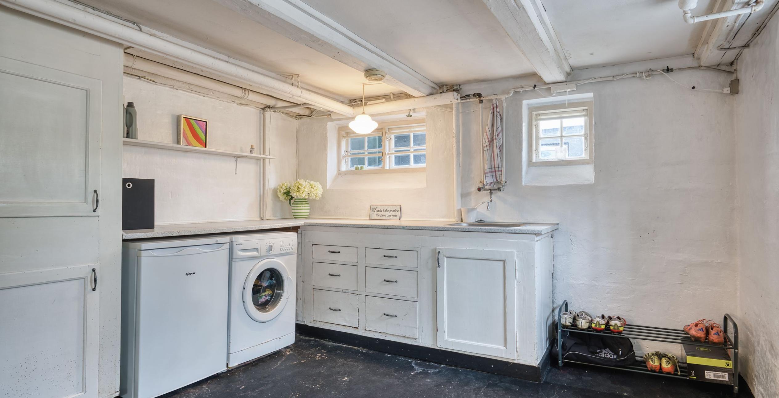 Kælderen fremstår tør og dermed anvendelig, og er indrettet med vaskerum/brygges og fyrrum, der også vil kunne benyttes til fx. værksted eller hobbyrum. Derudover et gæstetoilet med håndvask.