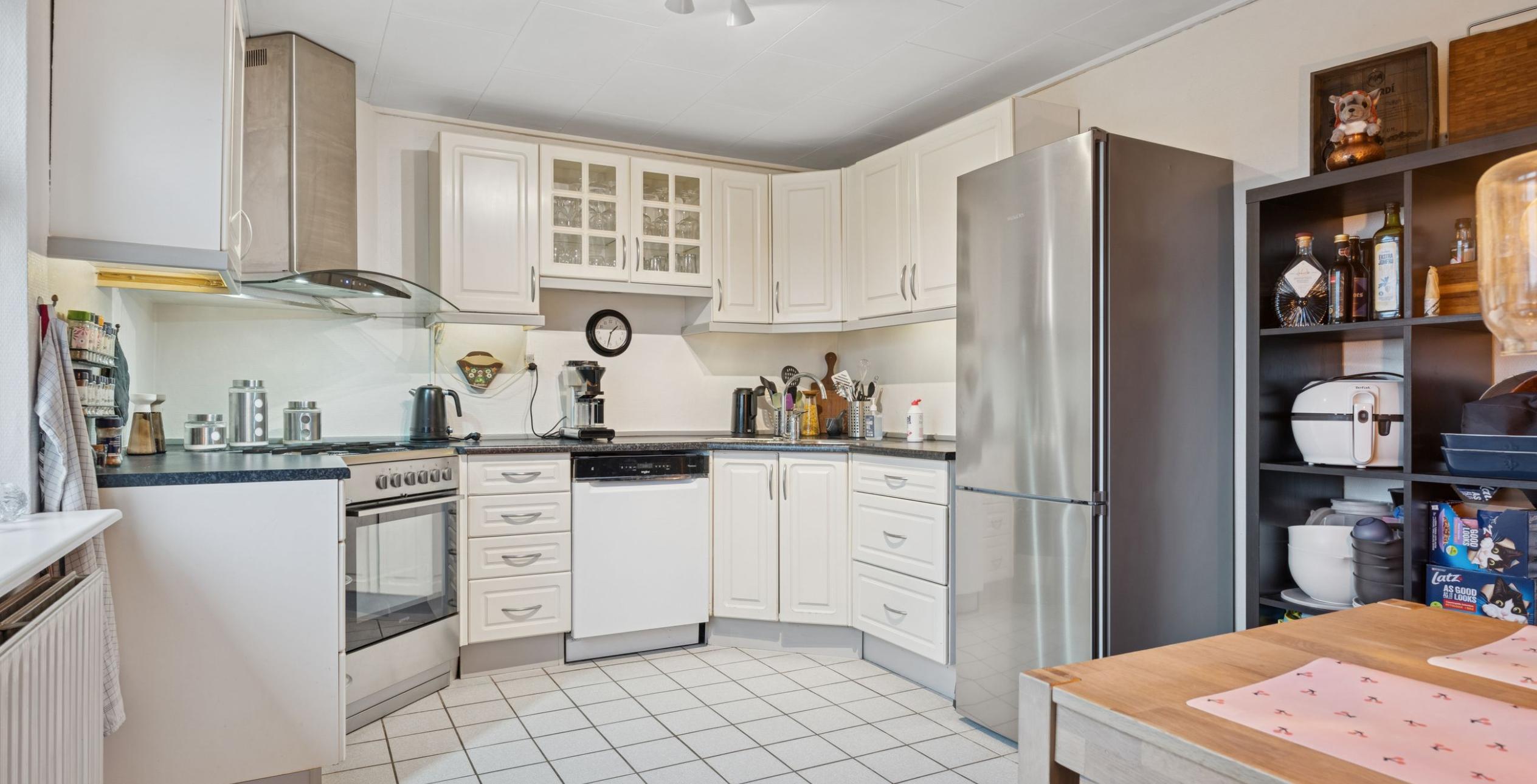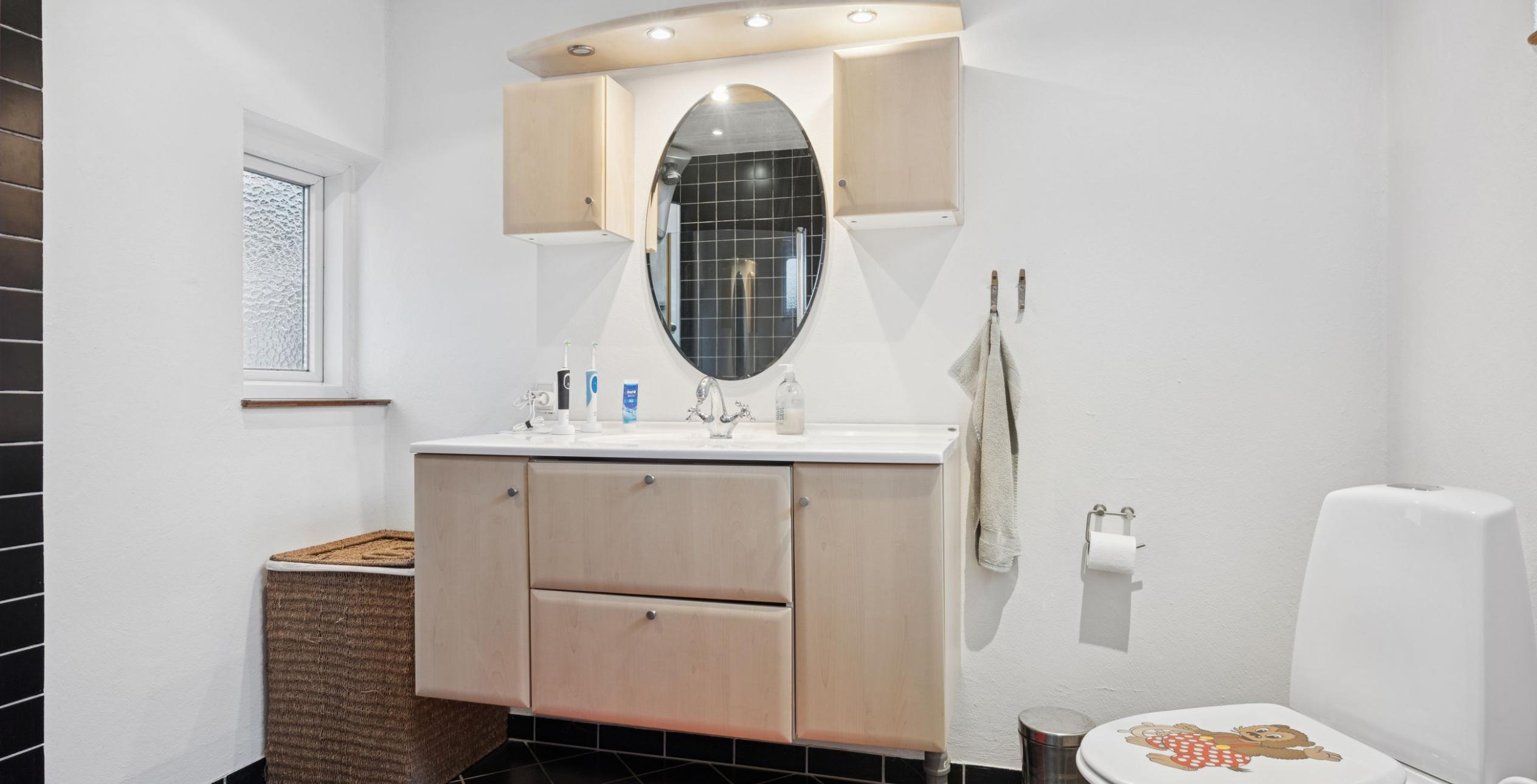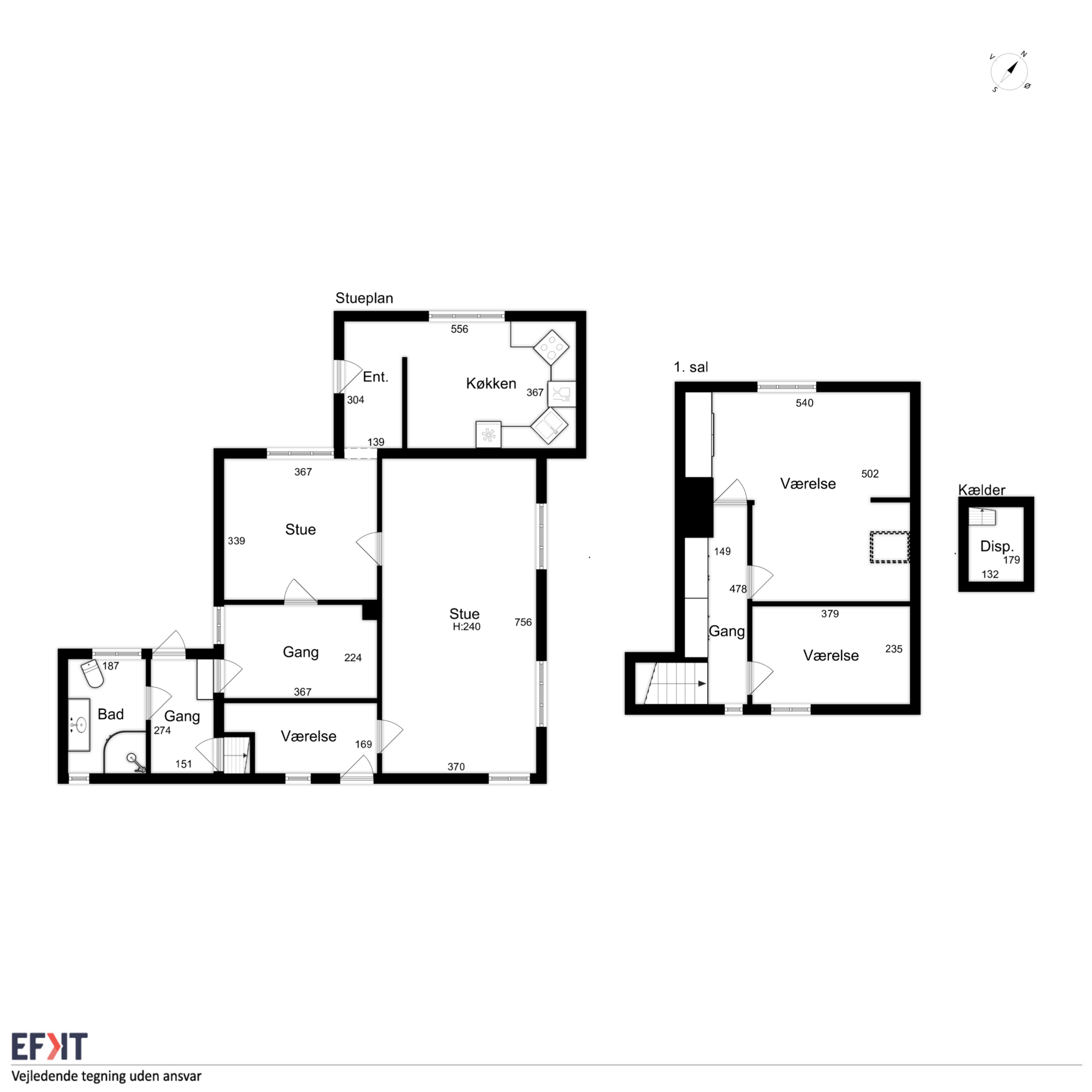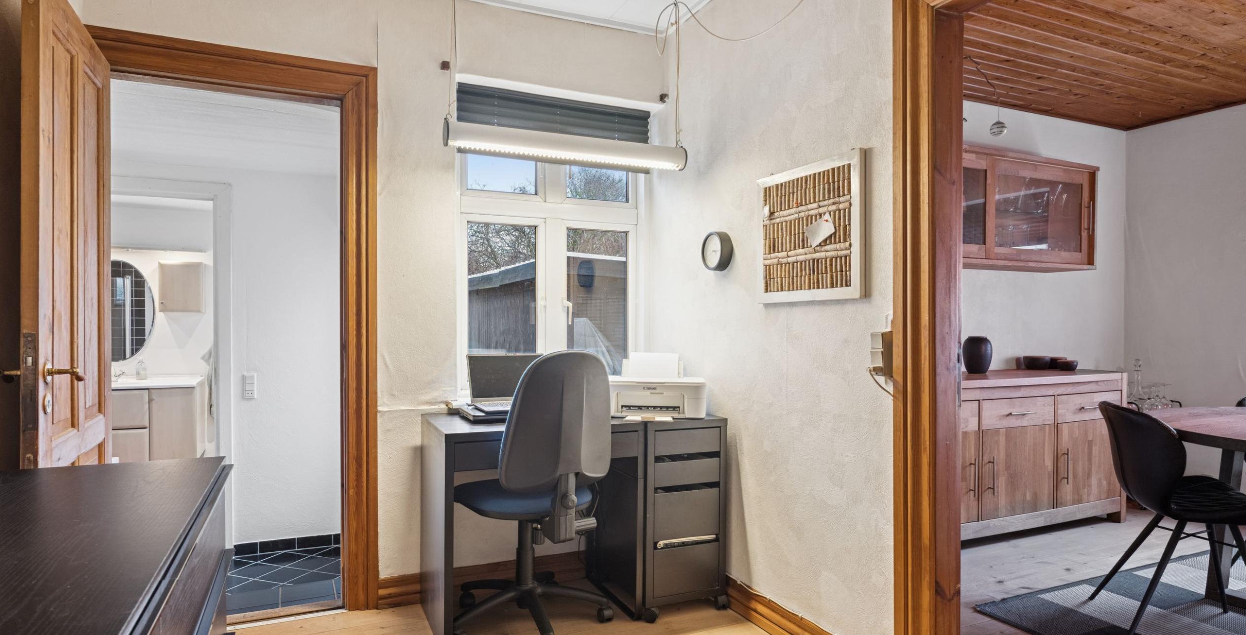 Ejendommen er indrettet med en præsentabel entré. Fra entréen er der adgang til den rummelige stue med plads til både spiseafdeling og sofagruppe til afslapning. I forlængelse af stuen ligger den lukkede spisestue, der også vil kunne benyttes som værelse i stueplan via en lille ændring af planløsningen. Herfra er der mindre mellemgang til det nydelige elementkøkken med spisekrog men også nedgang til lille viktualiekælder alene med plads til drikkelse, frugt eller grøntsager. Mellemgang og køkken er i øvrigt de eneste rum uden gulvvarme i stueplan. I sammenhæng med spisestuen ligger der et kontor, alternativt bibliotek eller opbevaringsrum, hvorfra der er adgang til baghuset. Endnu en mindre mellemgang, og ligeledes med udgang til det lukkede gårdmiljø, men også med trappe til 1. salen. Via mellemgangen ligger det nydelige flisebadeværelse med toilet, håndvask i skabsarrangement og luksus bruseniche med flere funktioner.