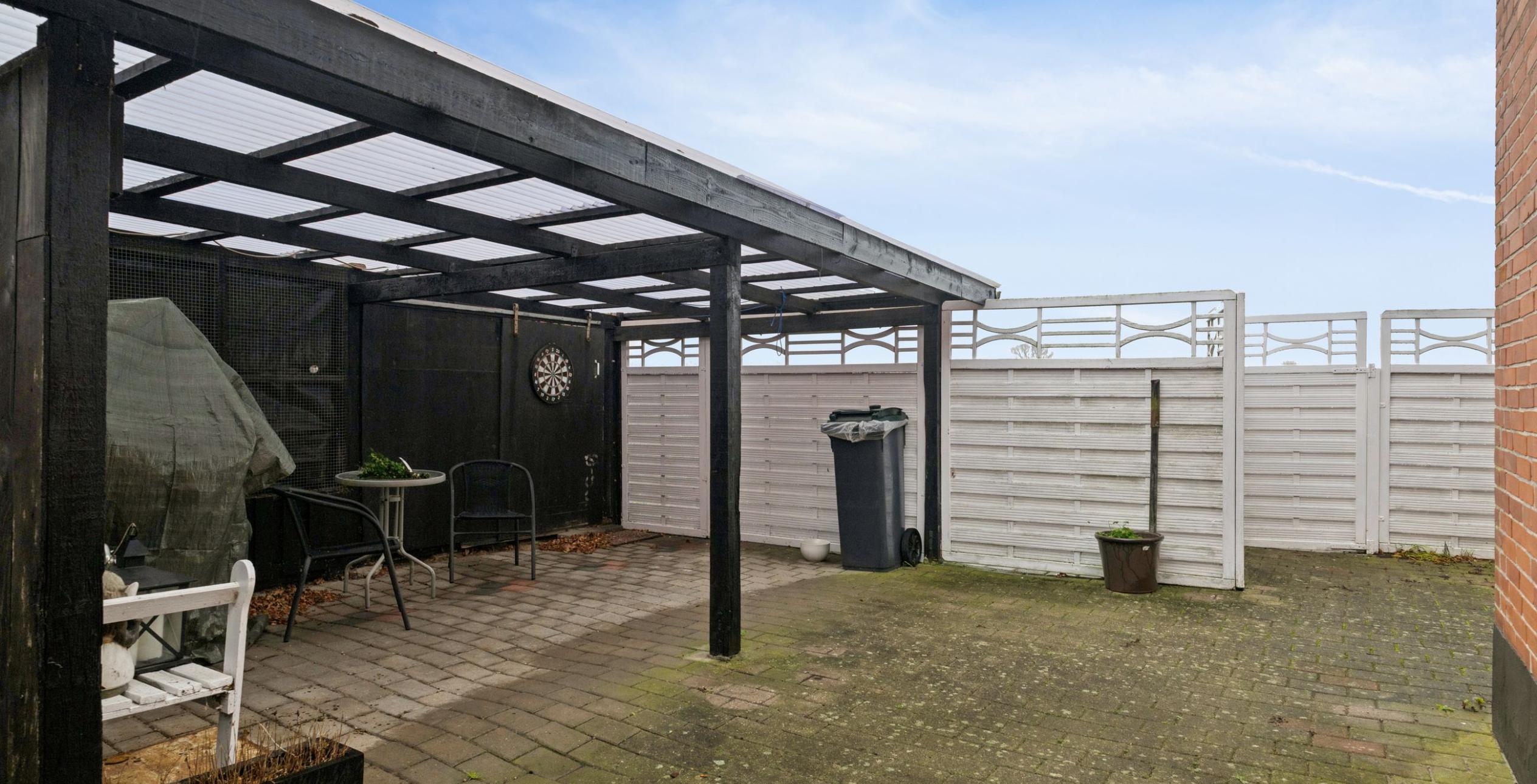 Til ejendommen hører en god carport, og flere udhuse samt en dejlig lukket baggård med overdækning, hvor privatlivet kan nydes i fulde drag. Derudover en charmerende og nem anlagt have, der er oplagt til socialt samvær med familie og venner.