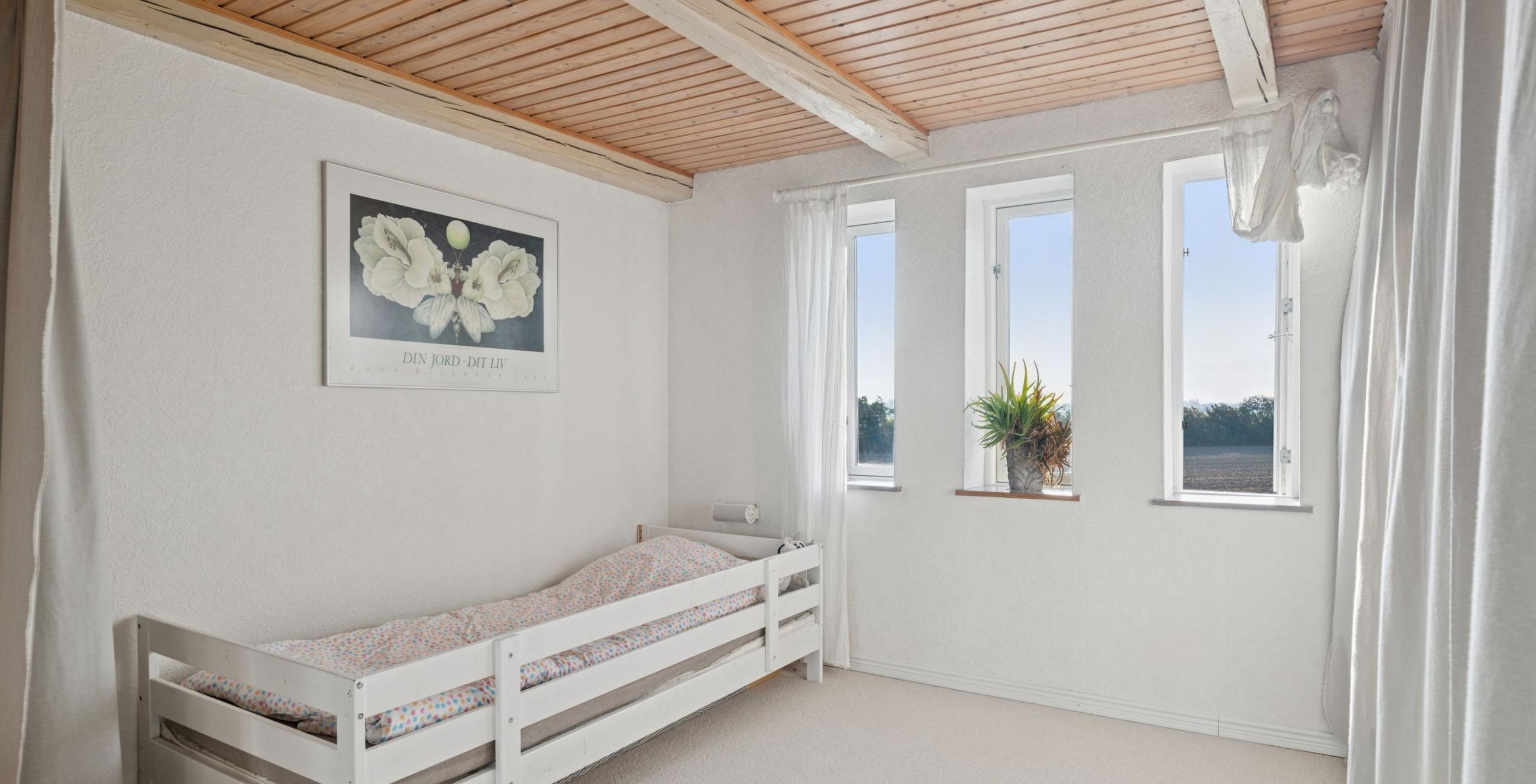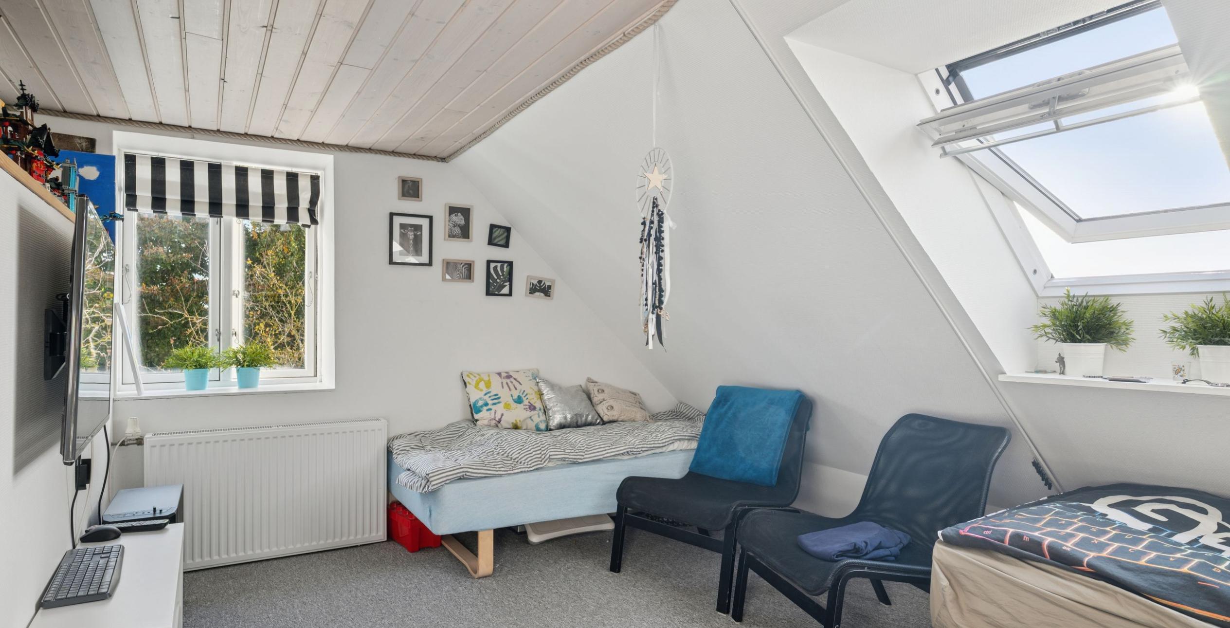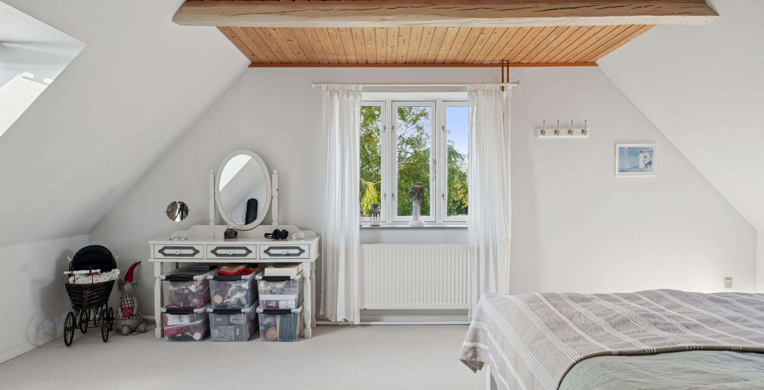 1. salen er indrettet med en mindre repos/fordelingsgang. Meget stort soveværelse med afblændet hems. Gennemgangsværelse der vil kunne indrettes som walk-in-closet. Derudover stort børne-/gæsteværelse med tilstødende uudnyttet og afblændet loftrum på ca. 10 kvm. der også vil kunne inddrages.