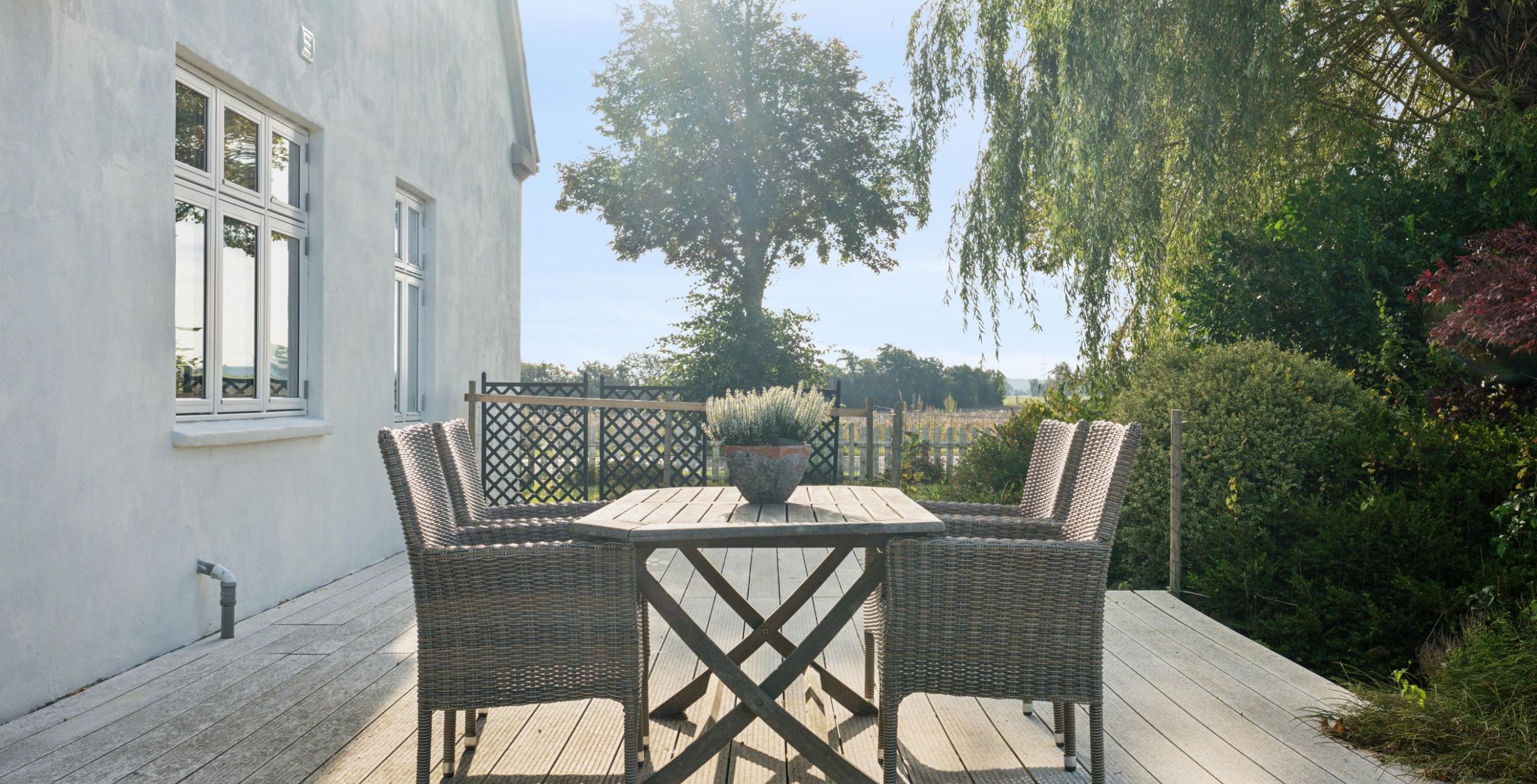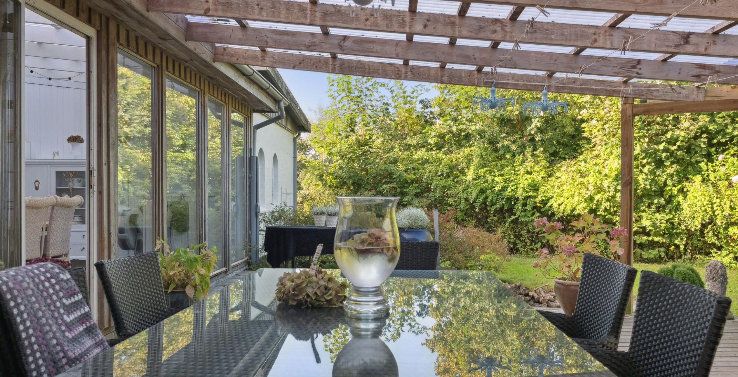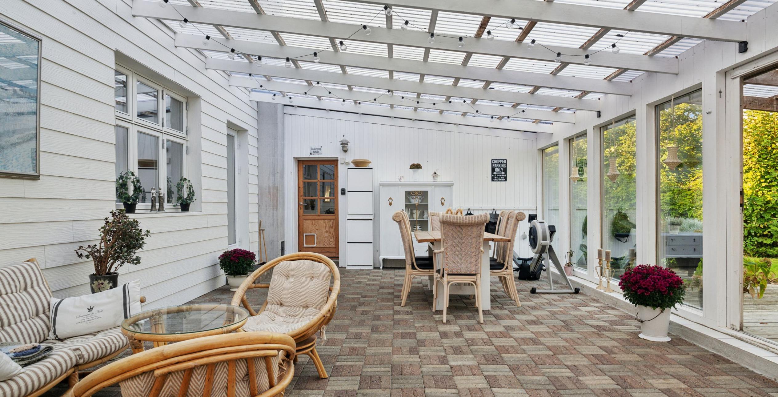Til ejendommen hører en dejlig garage, og store terrassearealer, der både er åbne men også delvist og helt lukkede, så alle muligheder er til stede, hvis udsigten til haven eller markerne skal nydes, eller der er tale om socialt samvær med hele den store familie uanset hvordan vejret viser sig. Haven kræver ikke den store vedligeholdelse, men er dejligt lukket og med flere solkroge, fiskebassin og forskellige frugttræer, hvorfor ejendommen med fordel også vil kunne benyttes som flexbolig uden bopælspligt fx i en overgangsperiode.