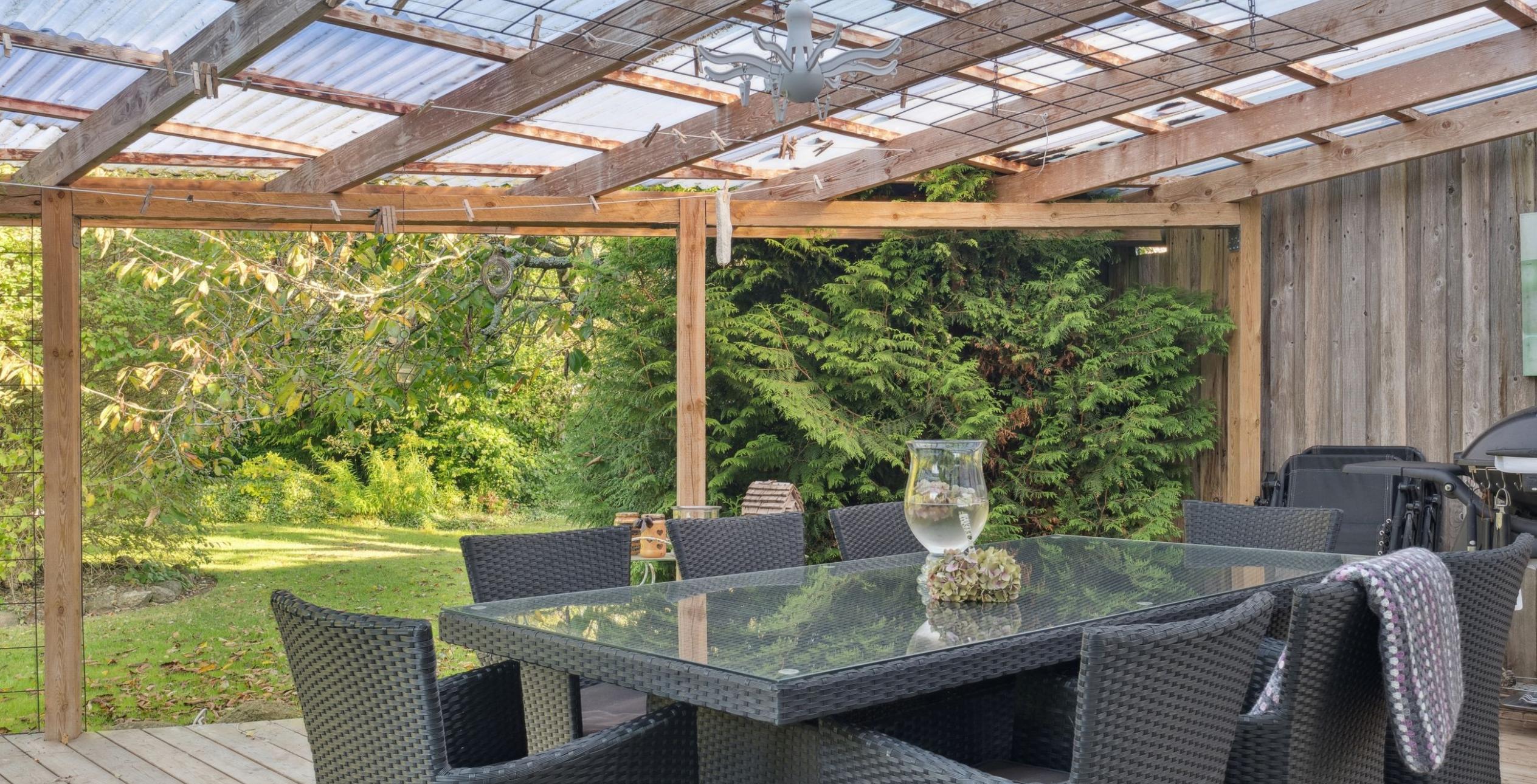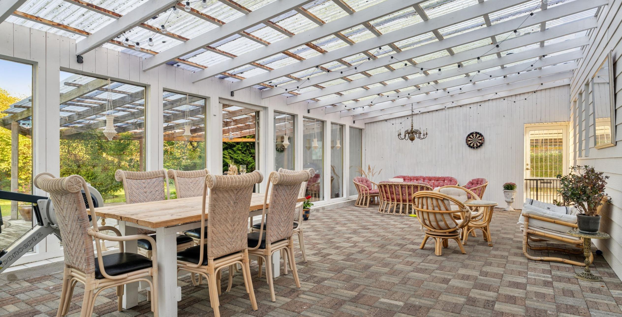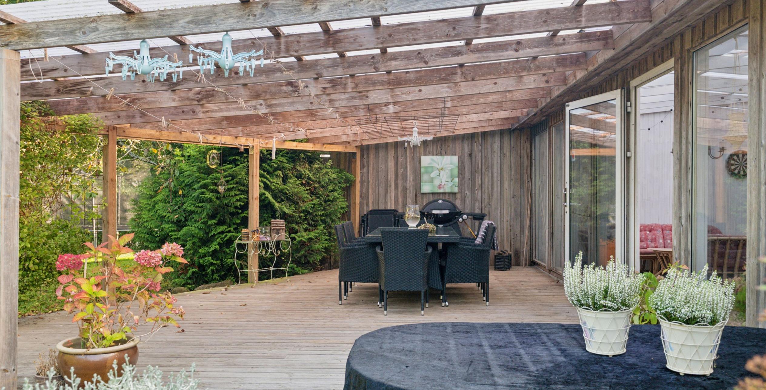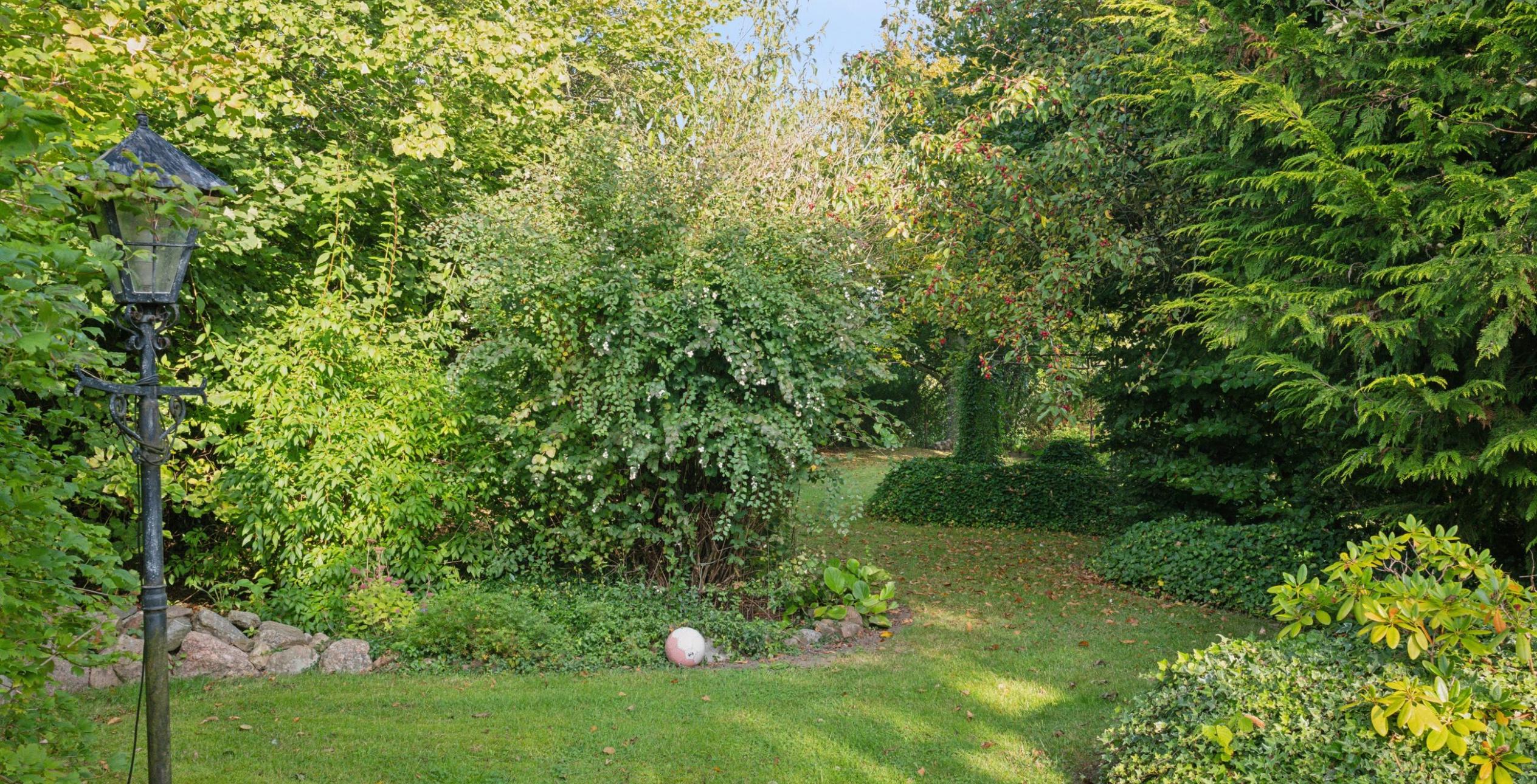 Til ejendommen hører en dejlig garage, og store terrassearealer, der både er åbne men også delvist og helt lukkede, så alle muligheder er til stede, hvis udsigten til haven eller markerne skal nydes, eller der er tale om socialt samvær med hele den store familie uanset hvordan vejret viser sig. Haven kræver ikke den store vedligeholdelse, men er dejligt lukket og med flere solkroge, fiskebassin og forskellige frugttræer, hvorfor ejendommen med fordel også vil kunne benyttes som flexbolig uden bopælspligt fx i en overgangsperiode.