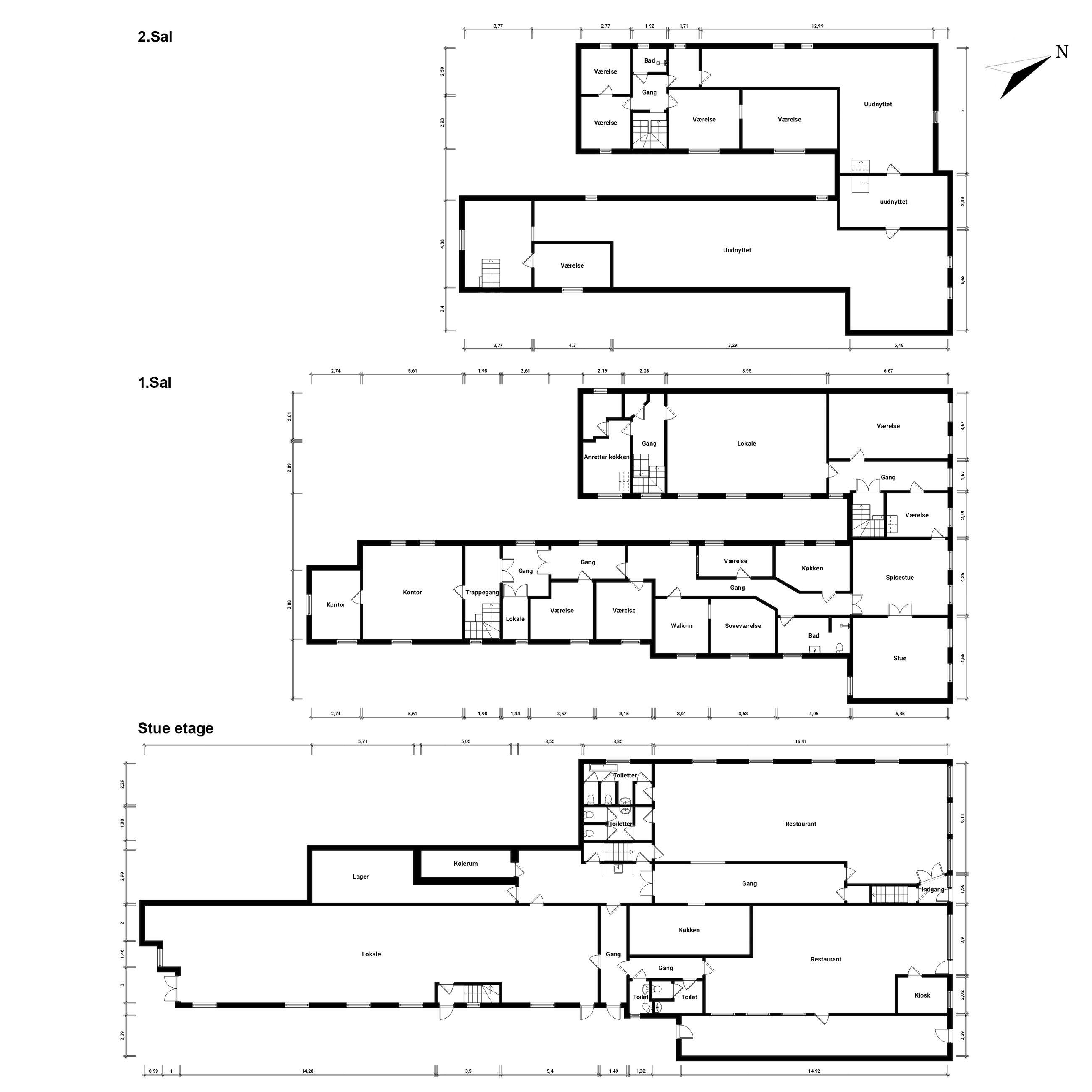 1. salen indeholder dels erhvervsareal på 208 kvm. med bl.a. et godt selskabslokale, foruden en lejlighed med et boligareal på i alt 175 kvm. indrettet med køkken, 2 sammenhængende stuer, badeværelse og 6 soveværelser udover yderligere disponible rum. 2. salen er indrettet med dels erhvervsareal på 130 kvm., som oprindeligt har været værelser til ansatte, foruden et stort uudnyttet loftrum.
