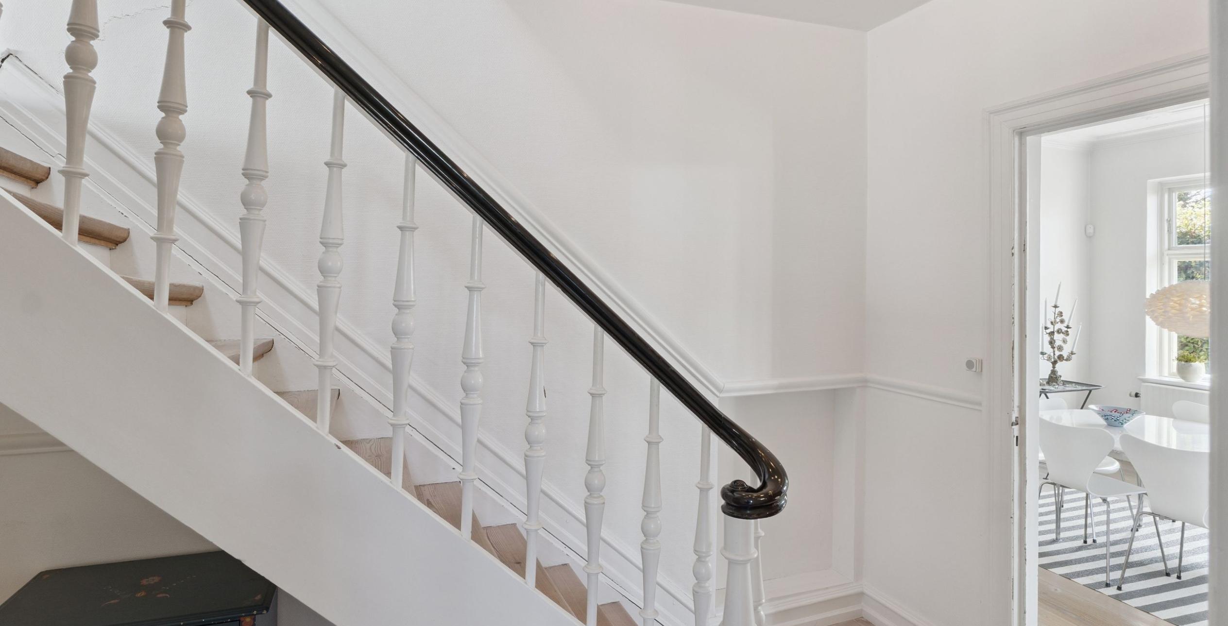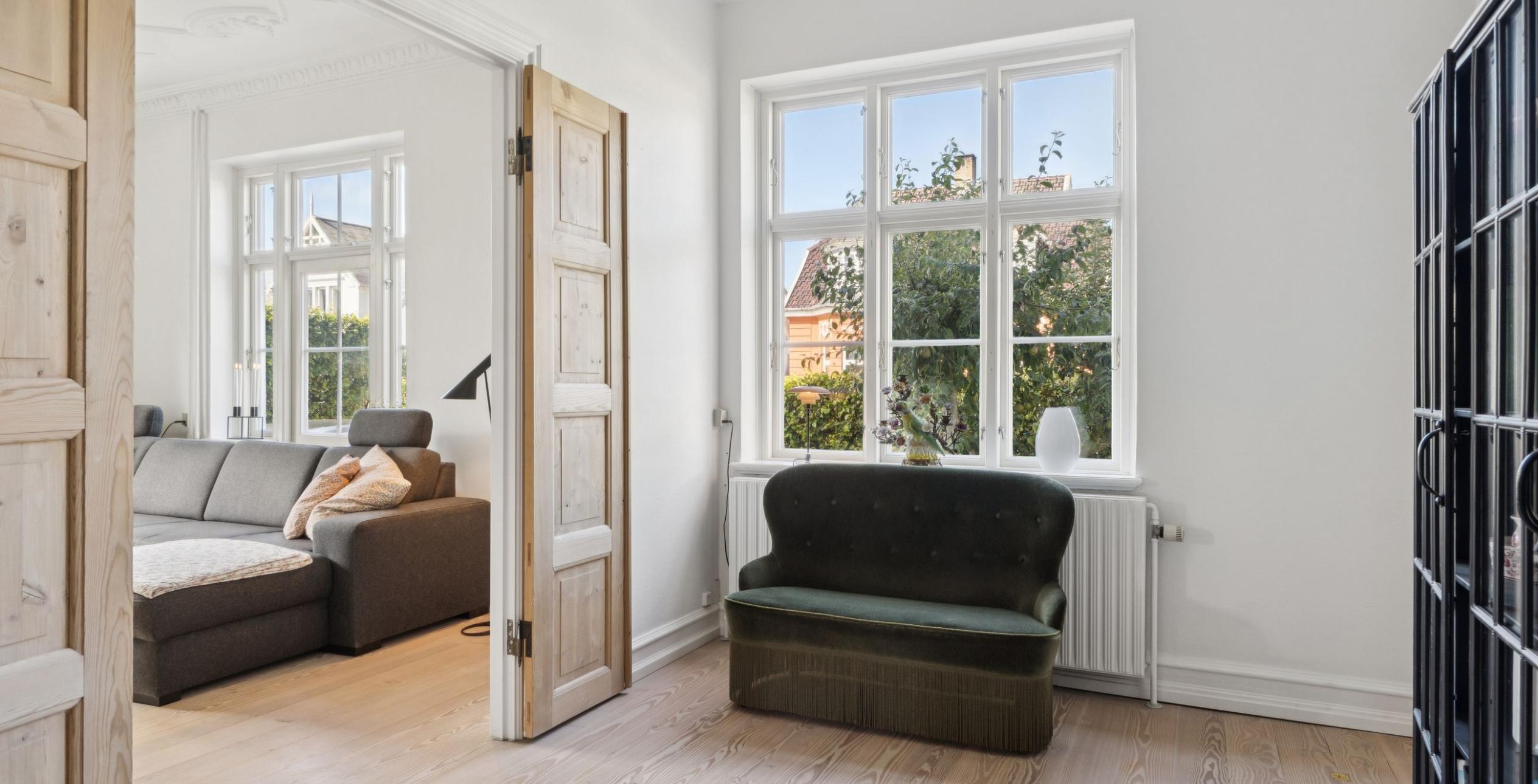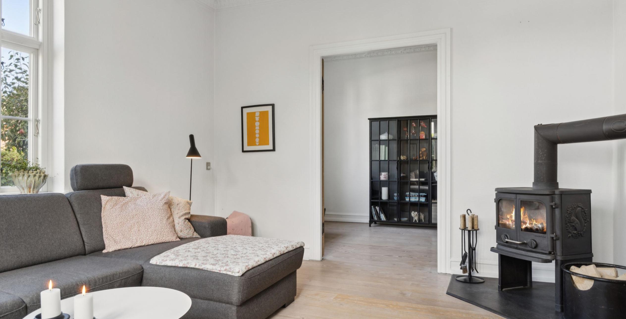 Ejendommen er indrettet med præsentabel entré med trappe til 1. salen. Fra entréen er der adgang til den første af stuerne en suite – det oprindelige ’herreværelse’. I forlængelse heraf ligger dagligstuen med et fantastisk lysindfald, ligesom der er installeret Morsø brændeovn. Rummelig spisestue, der ligger i naturlig sammenhæng med køkkenet, som er med høje paneler, fyldningslåger og vitrineskabe i tråd med den gennemgående charme. I forlængelse af køkkenet ligger bryggerset med vaskeafsnit og god bord-/skabsplads samt tilstødende viktualierum. Stort flisebadeværelse med toilet, dobbelt håndvask og bruseniche samt gulvvarme, der også er etableret i køkken og bryggers. Endelig velindrettet gæstetoilet med håndvask.