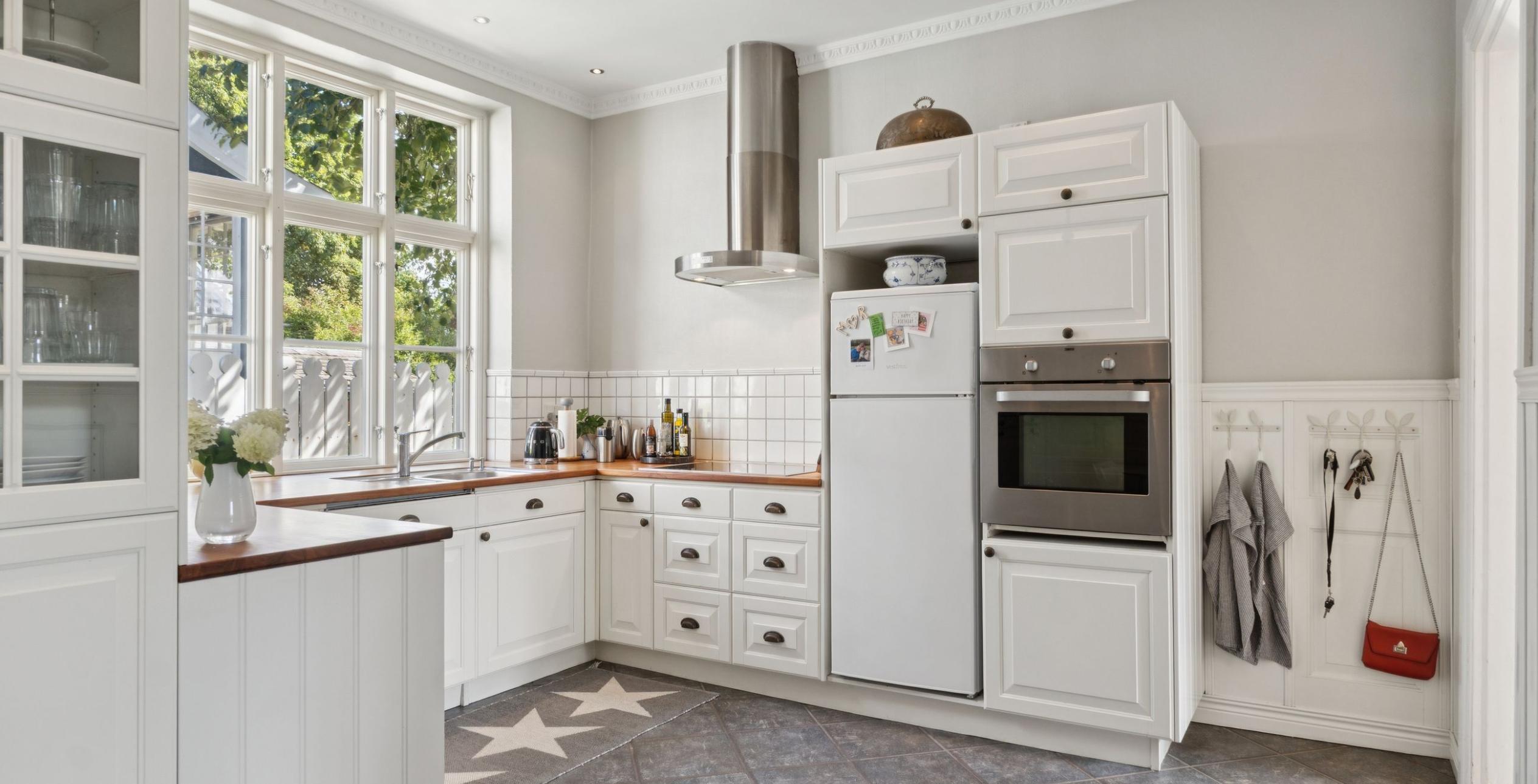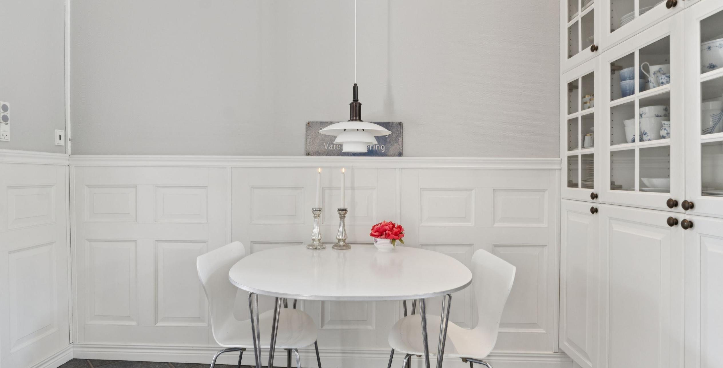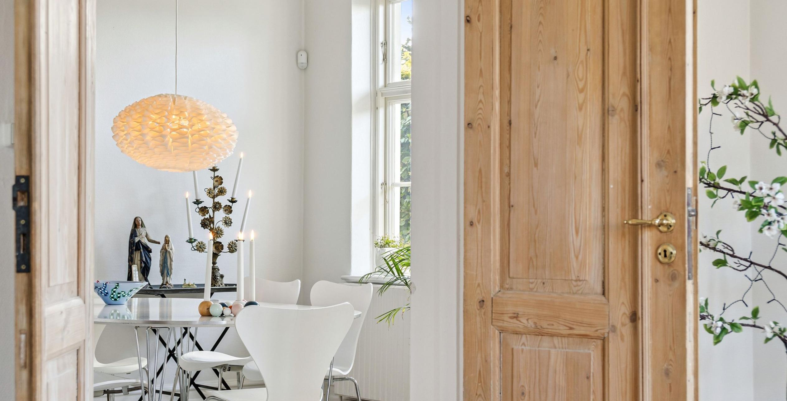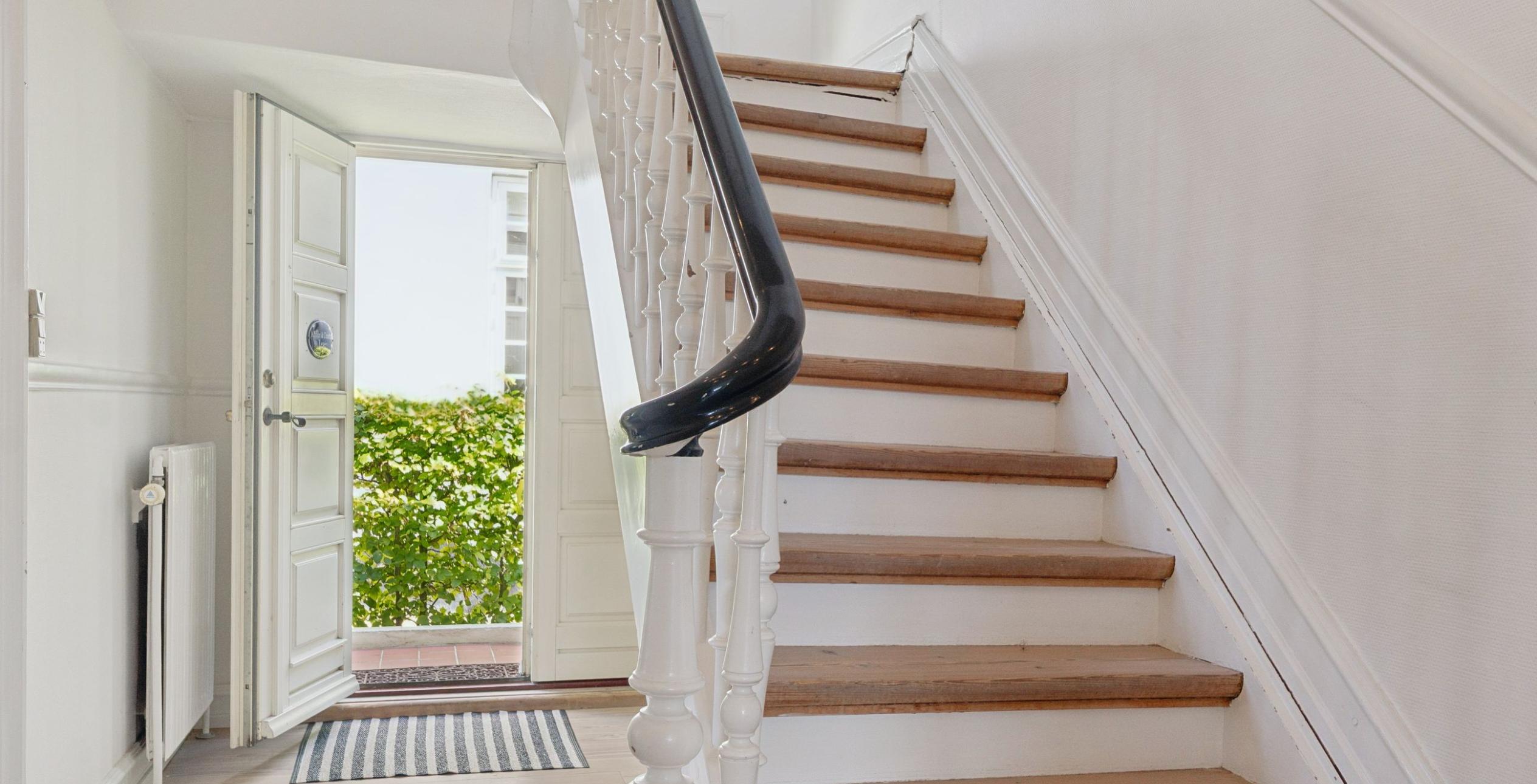 Ejendommen er indrettet med præsentabel entré med trappe til 1. salen. Fra entréen er der adgang til den første af stuerne en suite – det oprindelige ’herreværelse’. I forlængelse heraf ligger dagligstuen med et fantastisk lysindfald, ligesom der er installeret Morsø brændeovn. Rummelig spisestue, der ligger i naturlig sammenhæng med køkkenet, som er med høje paneler, fyldningslåger og vitrineskabe i tråd med den gennemgående charme. I forlængelse af køkkenet ligger bryggerset med vaskeafsnit og god bord-/skabsplads samt tilstødende viktualierum. Stort flisebadeværelse med toilet, dobbelt håndvask og bruseniche samt gulvvarme, der også er etableret i køkken og bryggers. Endelig velindrettet gæstetoilet med håndvask.