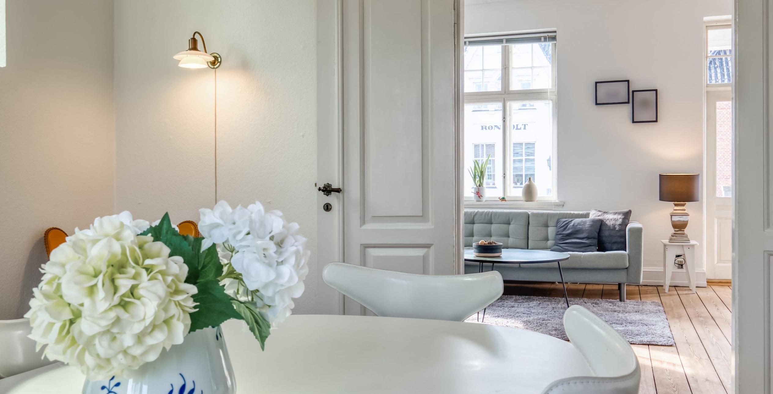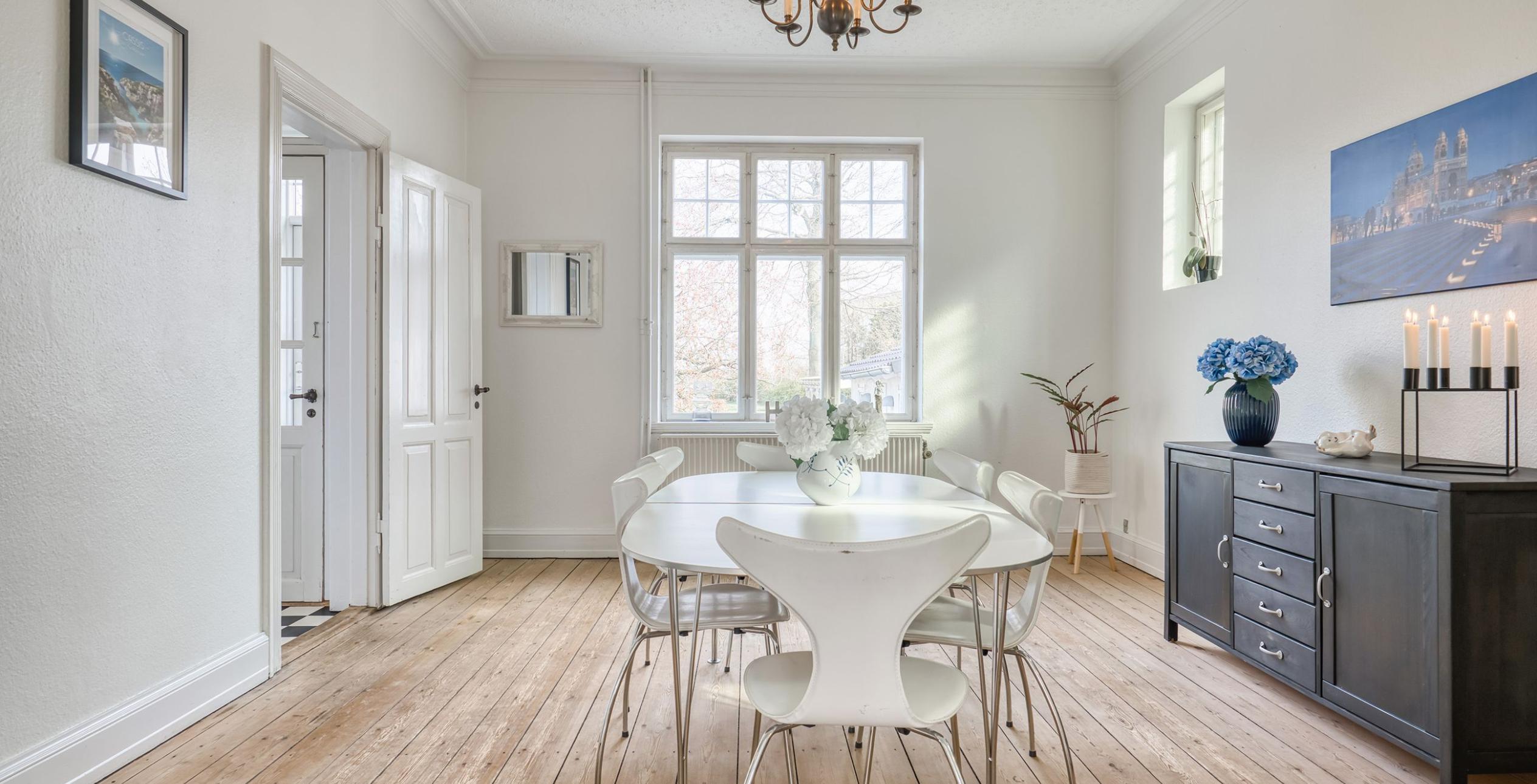 Ejendommen er indrettet med en flot og præsentabel entré. Den tidligere hall kan nemt reetableres ved at åbne til nuværende soveværelse. Fra entréen er der adgang til den store spisestue, hvor der er plads til besøg af den store familie. Med originale franske døre til dagligstuen er der rig mulighed for at lyset kan vandre, ligesom brændeovnen kan gøre en allerede hyggelig aften endnu hyggeligere. Fra dagligstuen er der udgang til den smukke veranda, hvor eftermiddagskaffen kan nydes. I naturlig og delvis åben forbindelse med spisestuen ligger det funktionelle og rummelige køkken med spisekrog, hvorfra der er udgang via mindre vindfang til gårdmiljøet.