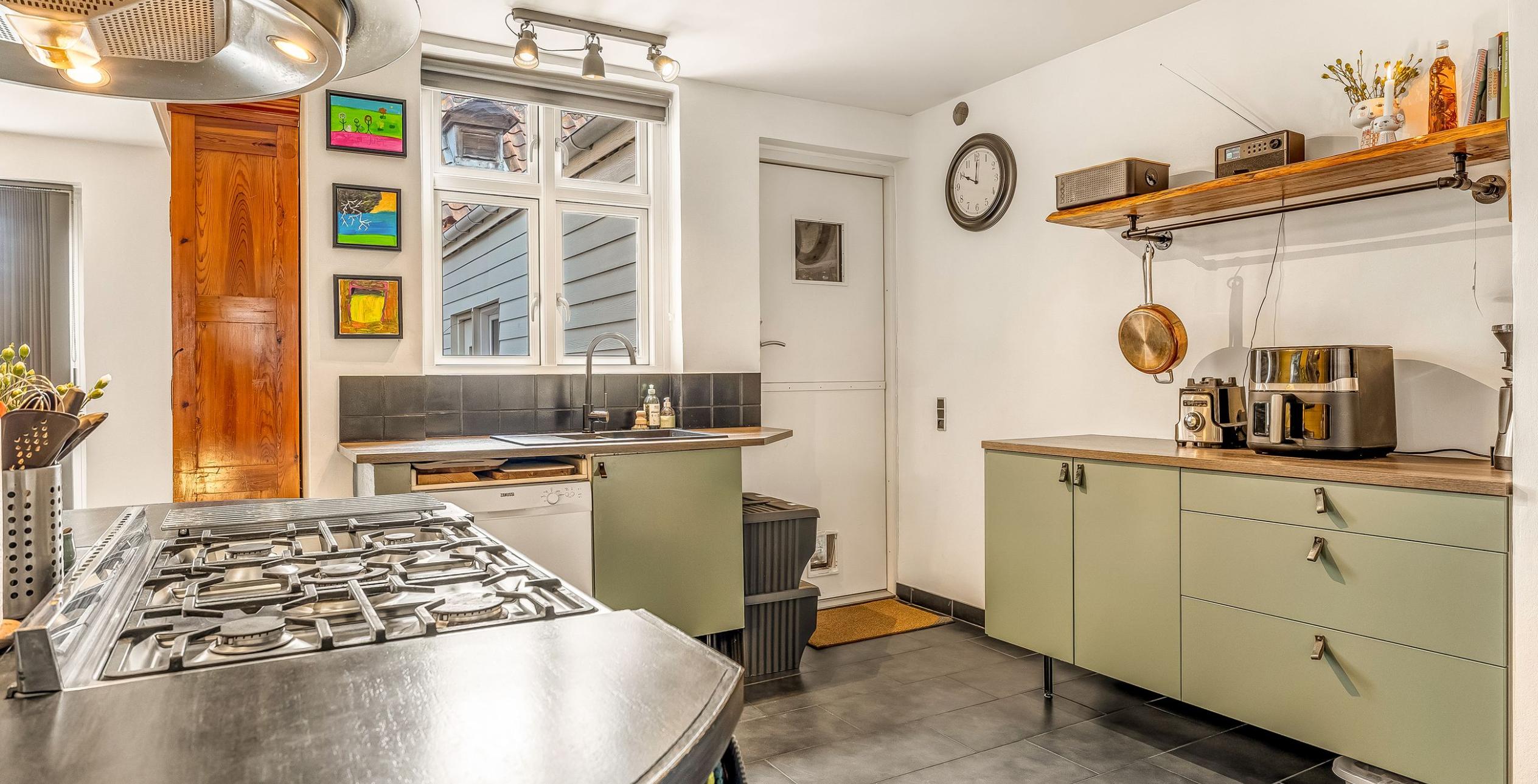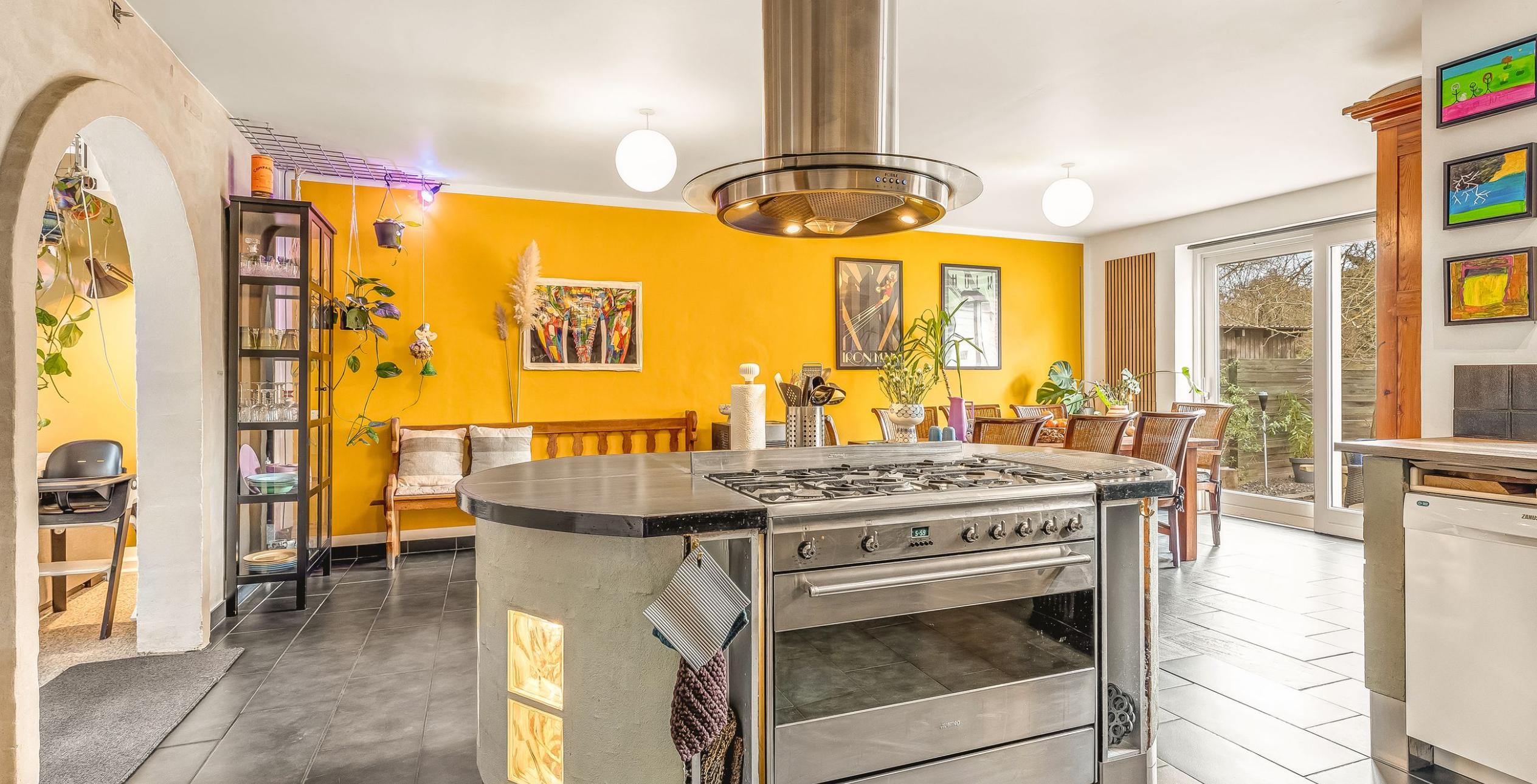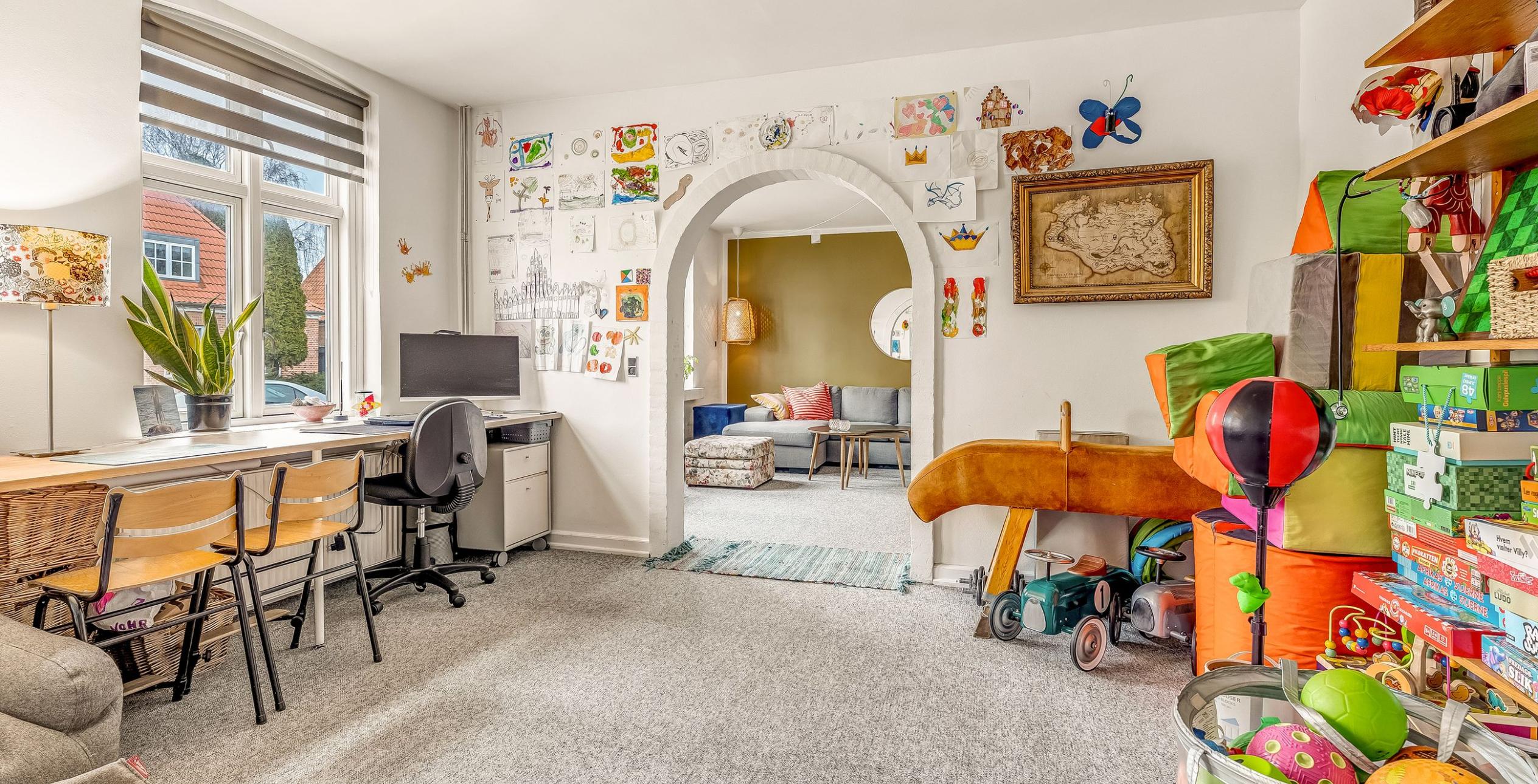 Ejendommen er indrettet med en præsentabel entré med klinkegulv og god trappe til 1. salen. Herfra er der adgang til 2 sammenhængende stuer, der både vil kunne lægges sammen eller lukkes, hvis fx et ekstra værelse ønskes. I forlængelse heraf ligger der flotte store køkken/alrum med gulvvarme og pilleovn, som er huset naturlige samlingspunkt, uanset om det er i en kombination af madlavning, lektielæsning, hjemmearbejde eller socialt samvær. Fra køkkenet er der både direkte udgang til haven, men også til baggården. Endelig er der i stueplan et nydeligt gæstetoilet med håndvask.